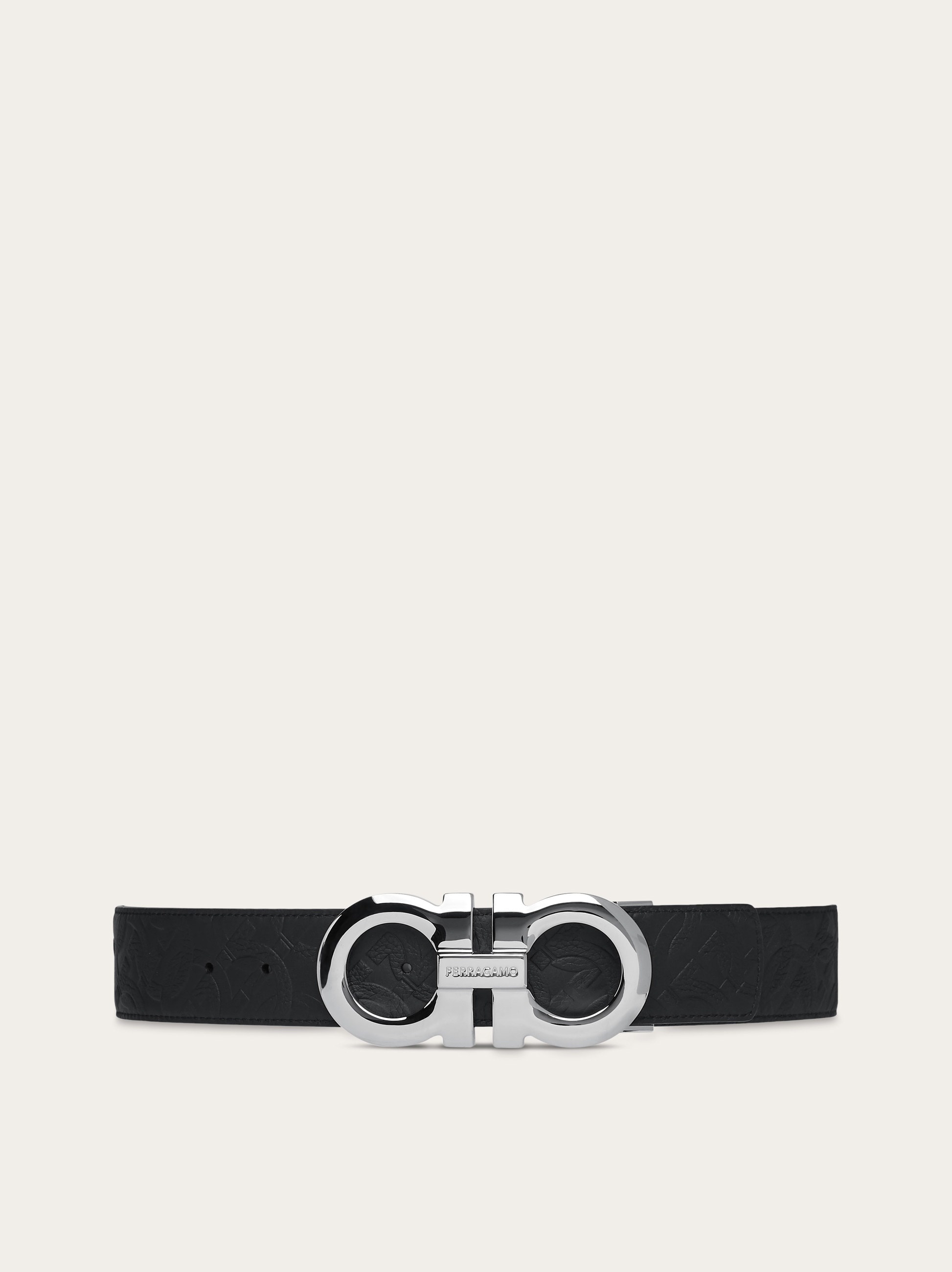 Unmistakably Ferragamo. The palladium tone Gancio buckle is the star of this reversible leather belt. One side is smooth, and on the other, the leather is tumbled and dyed with aniline for a sumptuous texture. The adjustable length allows for a more personalized fit and style. We invite you to check our size guide for more information. - height 1.5 IN - Composition: calfskin - Made in ITALY - Product code: 670270 765034