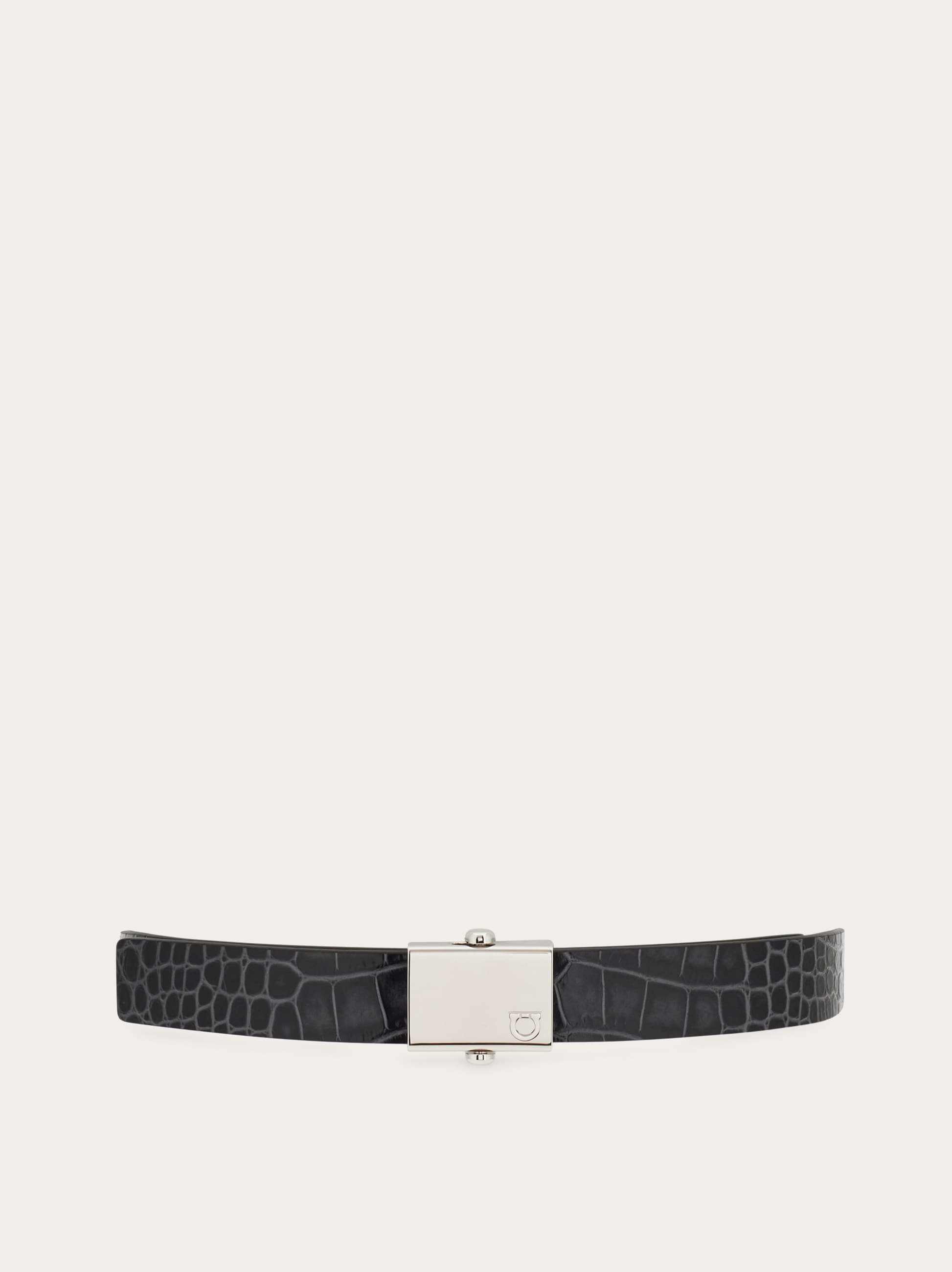 Reversible two-tone construction belt with one side in printed alligator effect leather and the other side in smooth finish. Finished with a flat buckle with a small embossed Gancini. The adjustable length allows for a more personalized fit and style. We invite you to check our size guide for more information. - height 1.1 IN - Composition: smooth and printed calfskin - Made in ITALY - Product code: 670456 784042