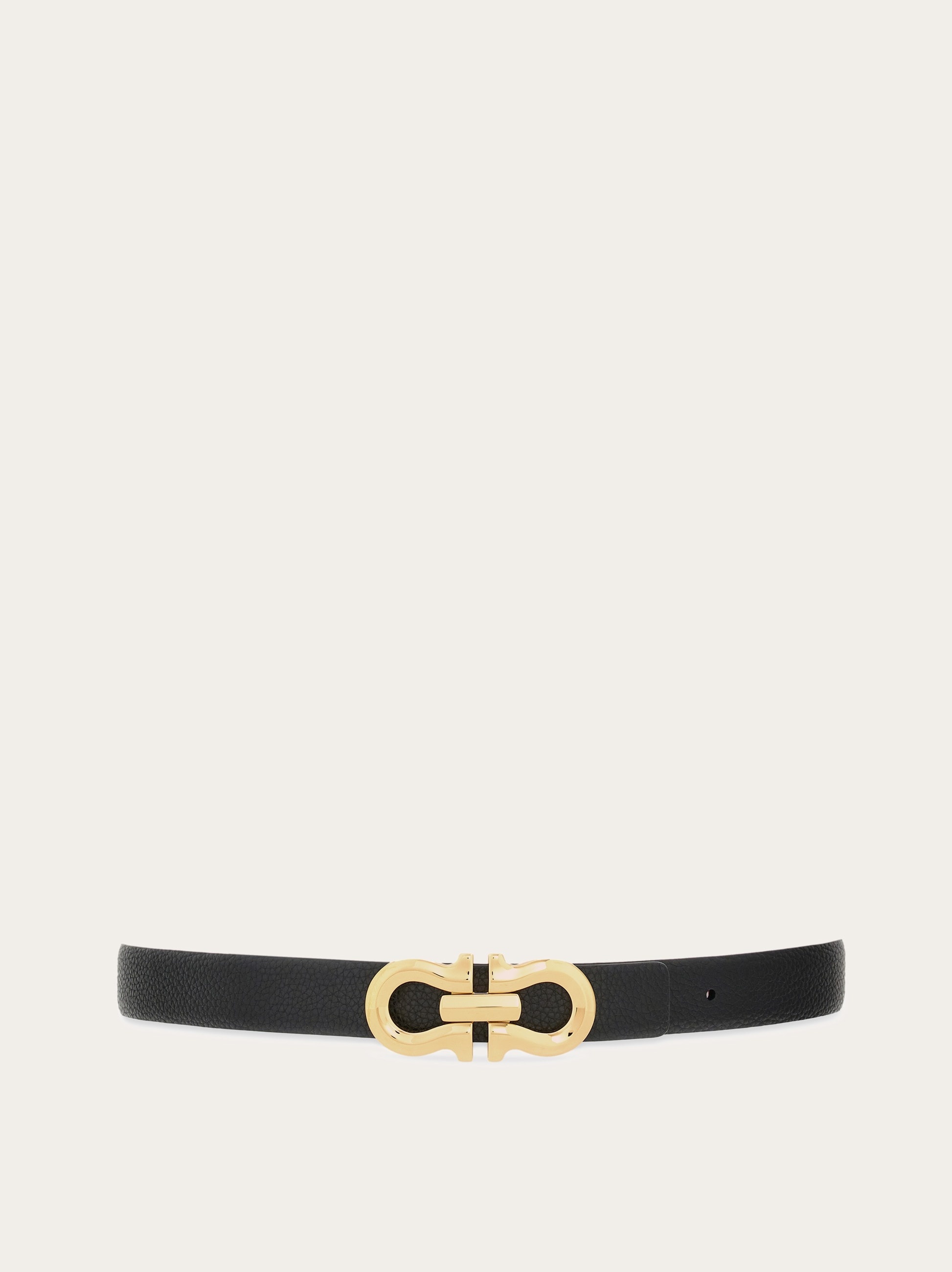Metropolitan flair and golden touches define this new Ferragamo belt. Crafted from hammered calf leather, it features a reversible two-tone construction that allows for multiple styling options. The stylized Gancini silhouette buckle adds a touch of elegance to the design. - height 0.9 IN - Composition: hammered calfskin - Made in ITALY - Product code: 230329 775596