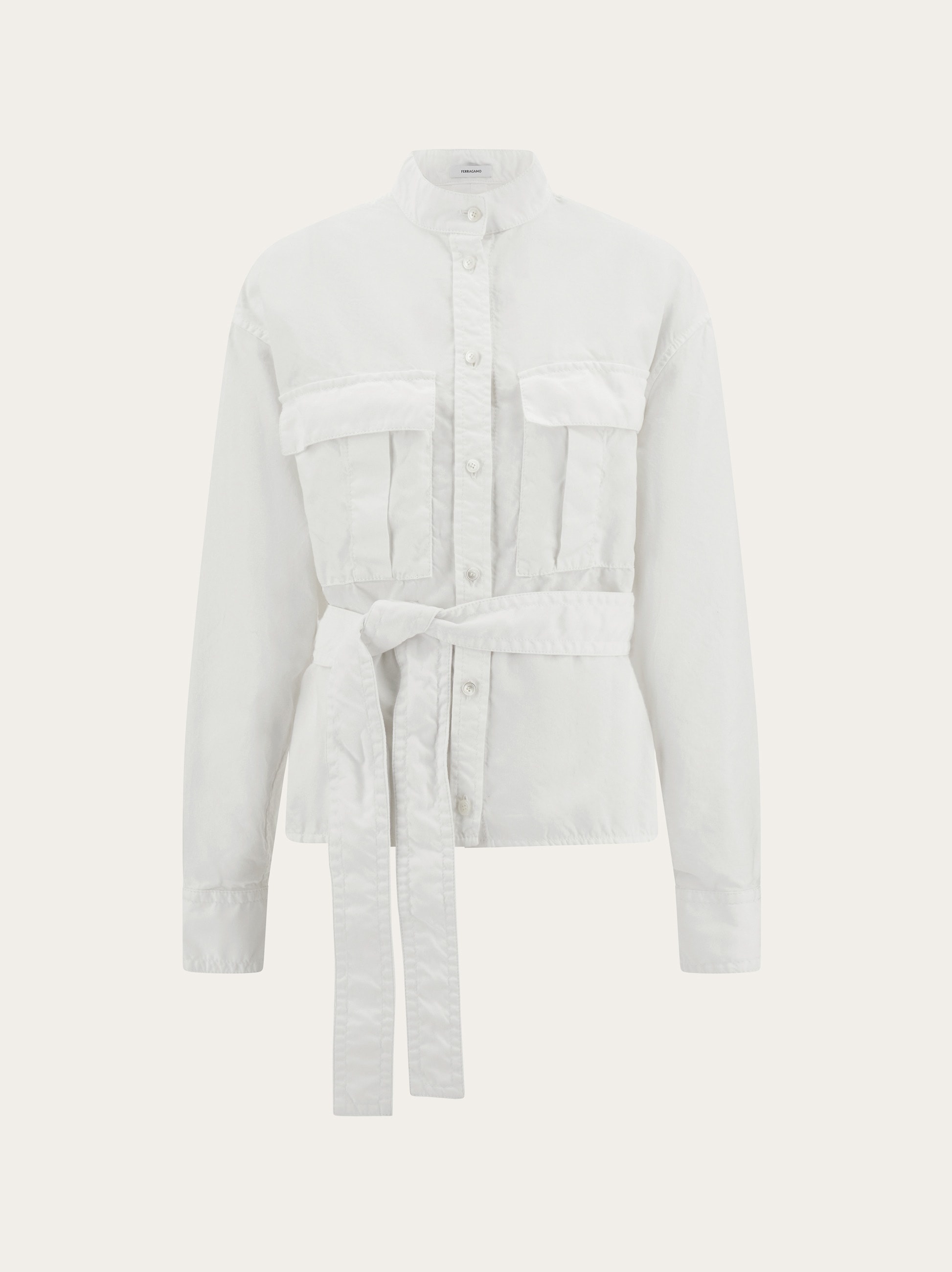 Utility style Saharan shirt cut from luminous cotton and viscose. The safari-inspired silhouette features large flap pockets on the chest, with a high neck and drop shoulder for a contemporary feel. A tonal sash cinches the volume at the waist. - Composition: 56% cotton, 44% viscose - Model measurements: Height 5' 10"/178 cm; Bust 32½ / 82cm; Waist 23½"/60 cm; Hips 34½"/87 cm - Model wearing: 38/XS - Made in ITALY - Product code: 13H270 783913