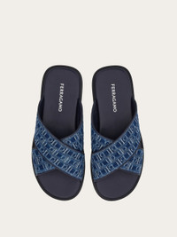 This summer sandal stands out with its crossover denim straps patterned with the Ferragamo Monogram. It has a smooth leather lining, a lightly cushioned leather insole, and a rubber sole with a custom tread. - Composition: fabric - Made in ITALY - Product code: 029932 782507