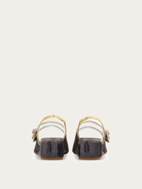 Wet look sequins give this new Ferragamo slingback a twist of directional glamour. A blend of contemporary and classic details, it is set on a covered block heel with a curved outline. Cabochon crystals are placed on the 'buttonholes' of the golden straps, and golden leather trims complete the design. - Composition: fabric and sequins - Made in ITALY - Product code: 01K856 787876