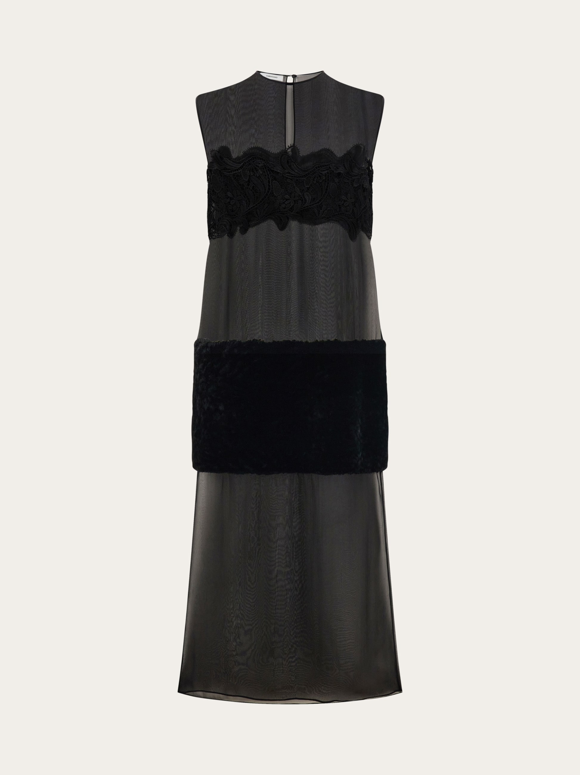 Contemporary elegance with a bold twist. Mid-length transparent chiffon sets the tone for this sensual sleeveless dress with high fashion details. Inlays of Italian lace and stretch merino shearling are strategically placed across the bust and hips for a new take on evening wear that is bold and extremely feminine. The low waist evokes a 1920’s aesthetic, the inspiration behind this season’s collection. - Composition: 100% silk - Made in ITALY - Product code: 13H659 788249