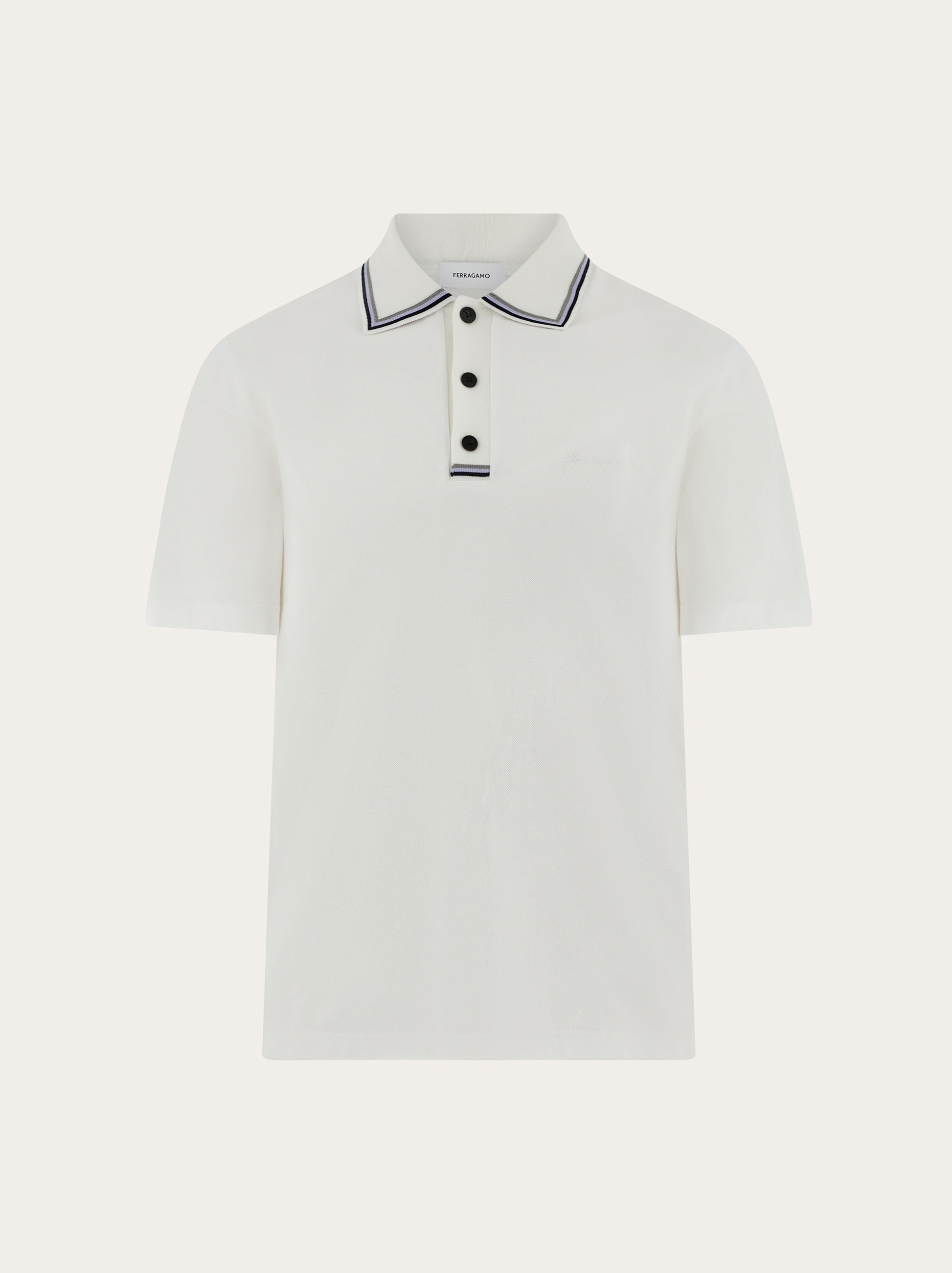 Made of organic cotton, this high fashion take on the classic polo shirt is classy and understated. Simple details include two tone jacquard lines under the placket and around the collar. A small tonal embroidered signature confirms a subtle elegance. - Composition: 100% organic cotton - Made in ITALY - Product code: 122431 776277