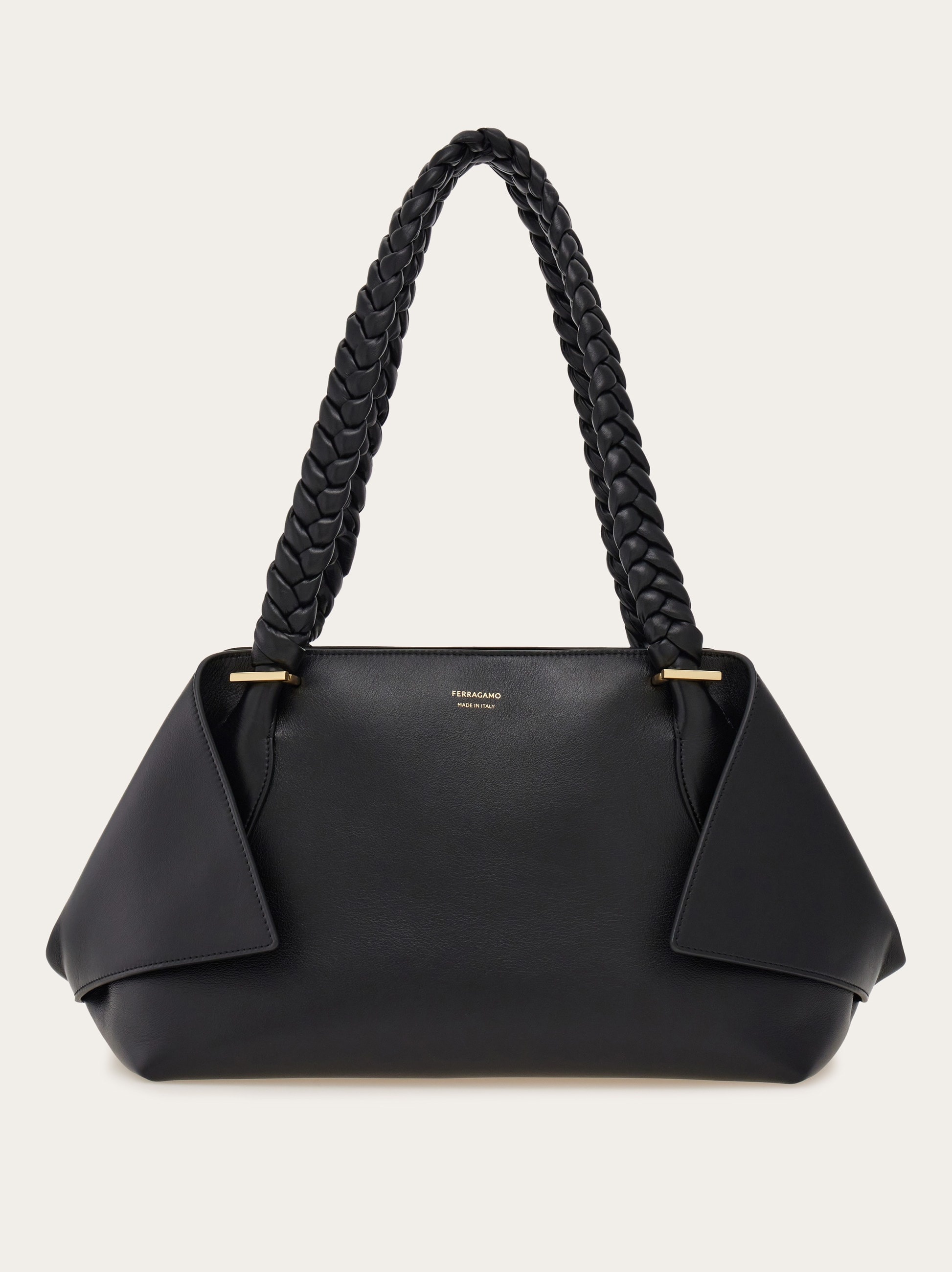 Ferragamo introduce a brand new silhouette: the Scarf bag. With its natural sophistication, the smooth calfskin leather billows at the sides like soft fabric, while the braided, mid-length top handle echoes the Brand’s artisanal flair. A double slider zip opens to reveal a spacious lined interior with zip pocket, and custom metal studs protect the base. - A) Height 9.4 IN B) Length 17.7 IN C) Width 7.4 IN - Composition: calfskin - Large - Made in ITALY - Product code: 219871 781020