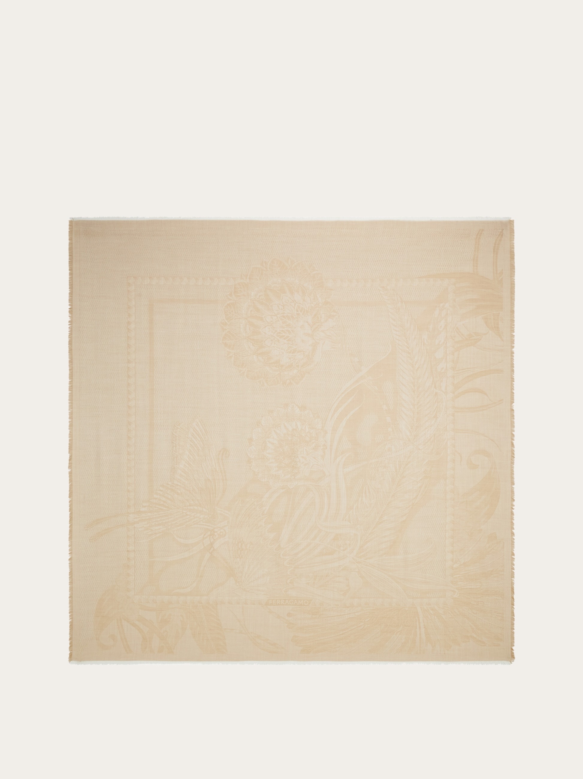Luminous, featherlight silk and warm, cozy cashmere come together to create this chic new stole. The large dimensions are the perfect backdrop for the jacquard workmanship used to create the Giada pattern, a motif made up of butterflies and dancing flowers set on a geometric frame. - length 55.1 IN width 55.1 IN - Composition: 46% silk, 40% wool, 14% cashmere - Made in ITALY - Product code: 321166 785351