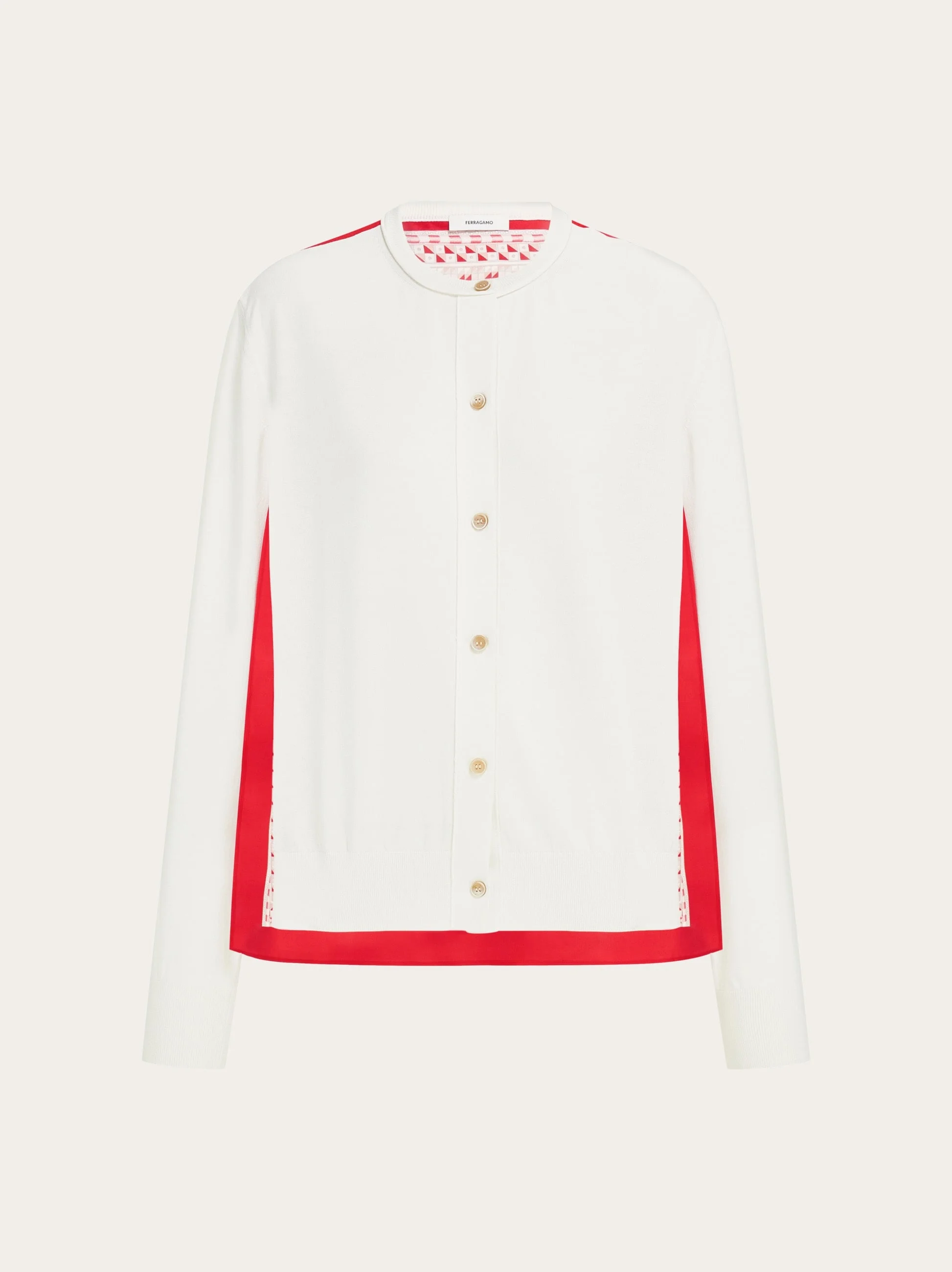 Long-sleeved cardigan crafted from a refined cotton–silk knit, enhanced by an exclusive printed silk twill panel at the back. The design blends the clean lines of classic knitwear with a feather-inspired print, creating an elegant contrast of textures and lightness. Fully fashioned construction ensures a fluid, comfortable fit, while the silk insert adds movement and a sophisticated graphic touch. A versatile and distinctive piece, perfect for elevating everyday looks or completing more polished outfits with contemporary elegance. - Composition: 70% cotton, 30% silk - Made in ITALY - Product code: 13I238 792453