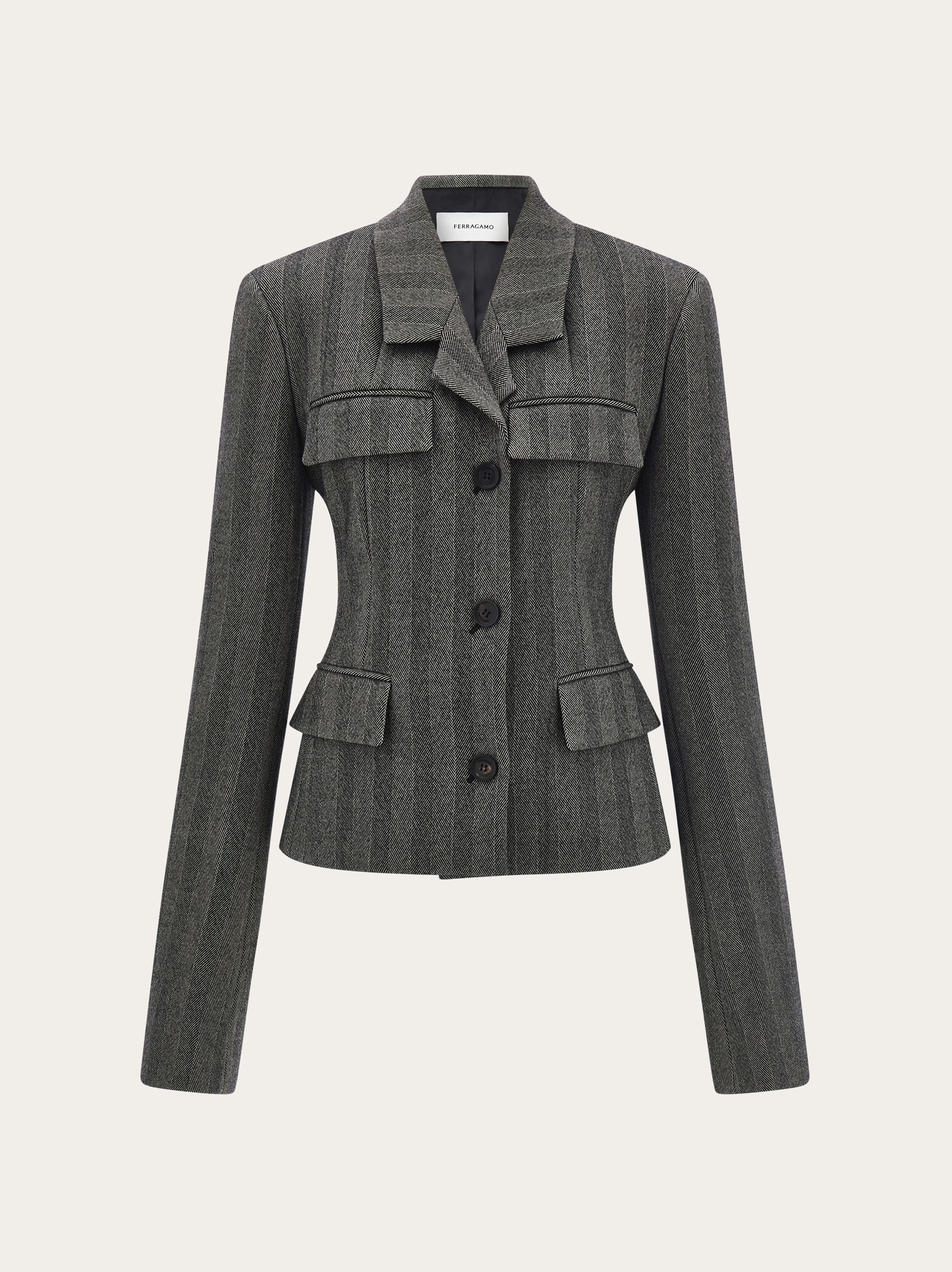 The decidedly feminine silhouette of this single-breasted blazer is cut from soft, stretchy chevron. The fabric is a blend of wool and elastane, and has been described as a modern twist on herringbone, and features a repeating zigzag pattern that forms an inverted V shape. Four flap pockets add a military twist to the ladylike outline, inspired by military uniforms from the 1920s. Back slits complete the design. - Composition: 92% pure virgin wool, 6% polyamide, 2% elastane - Made in ITALY - Product code: 13H682 788119