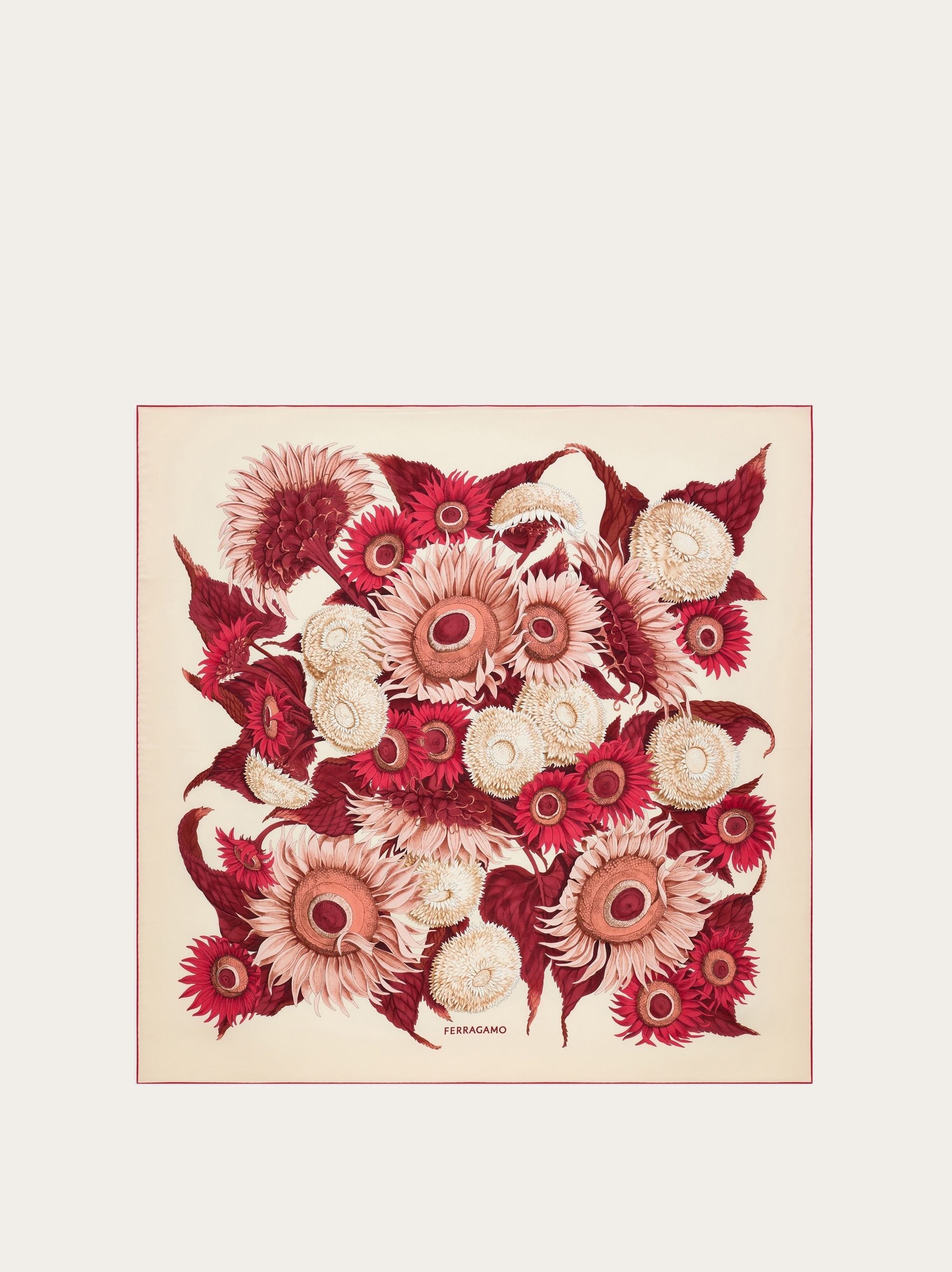 Inspired by a heritage motif and reimagined with up-to-date shades and details, this pure silk twill scarf is decorated with a luxurious bouquet of sunflowers. A symbol of joy, positivity, strength and loyalty, the sunflower is one of the motifs favored by Salvatore Ferragamo in his compositions. - length 35.4 IN width 35.4 IN - Composition: 100% silk - Made in ITALY - Product code: 310196 780051