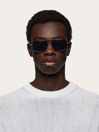 These extraordinarily lightweight navigator-shaped double-bridge sunglasses feature metal temples decorated with a prism-effect Gancini detail that integrates the hinge and extends to the lenses. - Composition: metal - Anti-UV, anti-scratch lenses - Adjustable silicone nosepads, suitable for any fit. Lens-nose-temple size: 58-17-145 mm - Frame compatible with graduated lenses - Made in ITALY - Product code: 51S313 774415