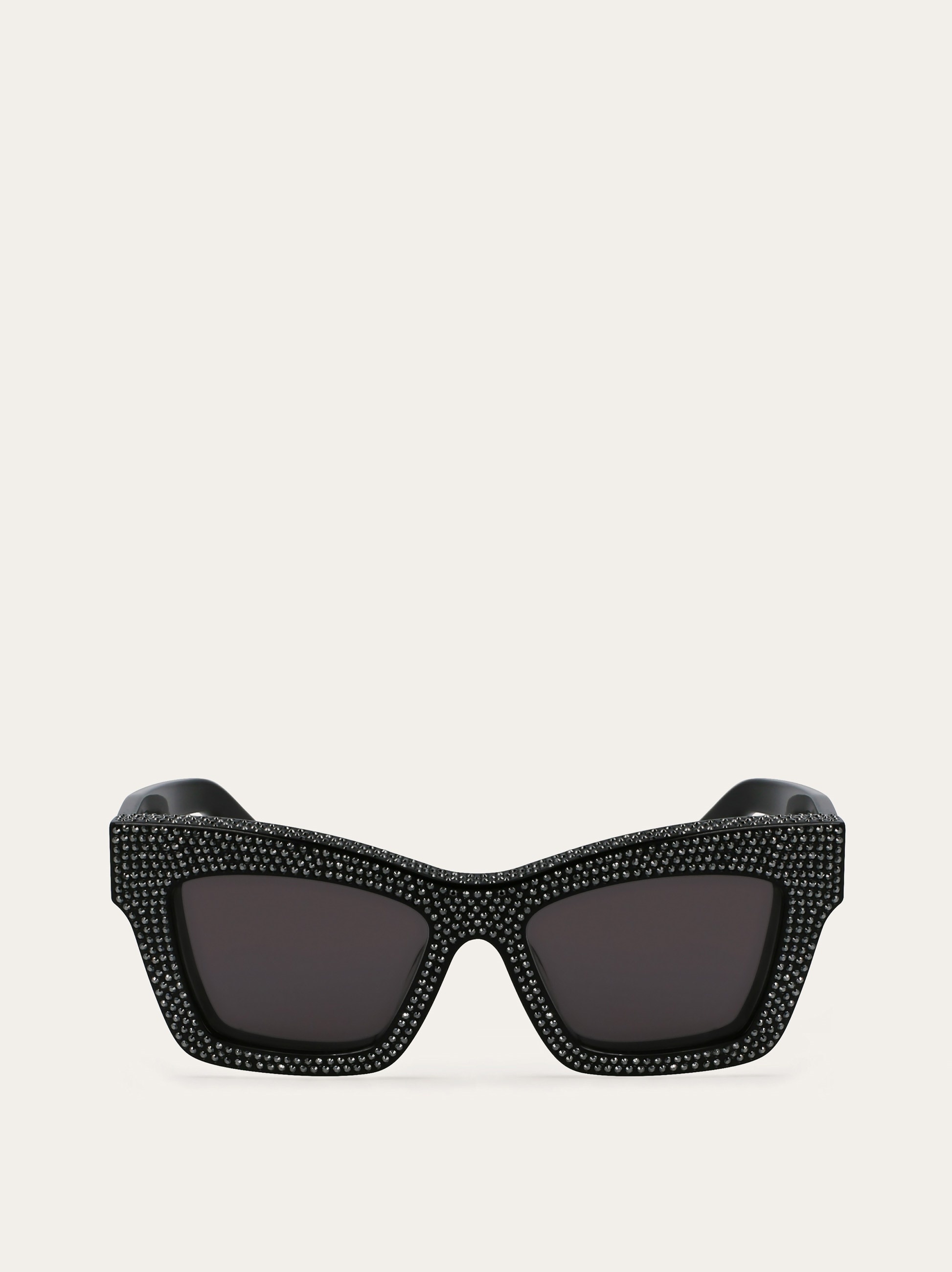 Sunglasses featuring a distinctive design that reflects the Maison’s artisanal excellence and spirit of innovation. The model combines heritage and modernity in a rectangular acetate silhouette, defined by bold profiles, accentuated angles and a refined decoration created with 793 Swarovski “chaton” crystals meticulously applied by hand on the entire front and shaped with a special “Xilion” cut that enhances their sparkle. - Composition: acetate with Swarovski crystals - Anti-UV and anti-scratch lenses - Universal fit.|Lens-nose-temple size: 52-17-140 mm - Frame compatible with graduated lenses. - Made in ITALY - Product code: 51H045 782173