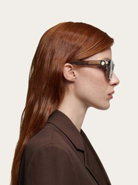 Women’s square-shaped acetate sunglasses characterized by bulky profiles. The Gancini ornament on the temples incorporates the hinge, thus becoming a functional element too. The temples reveal their metal core in the transparent colour versions. - Composition: acetate - Anti-UV and anti-scratch lenses - Global Fit. Lens-nose-temple size: 52-21-140 - Frame compatible with graduated lenses - Made in ITALY - Product code: 51H066 786640