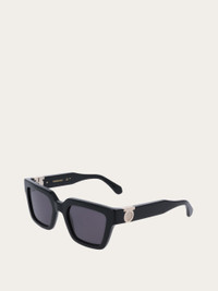 Women’s square-shaped acetate sunglasses characterized by bulky profiles. The Gancini ornament on the temples incorporates the hinge, thus becoming a functional element too. The temples reveal their metal core in the transparent colour versions. - Composition: acetate - Anti-UV and anti-scratch lenses - Global Fit. Lens-nose-temple size: 52-21-140 - Frame compatible with graduated lenses - Made in ITALY - Product code: 51H066 786639