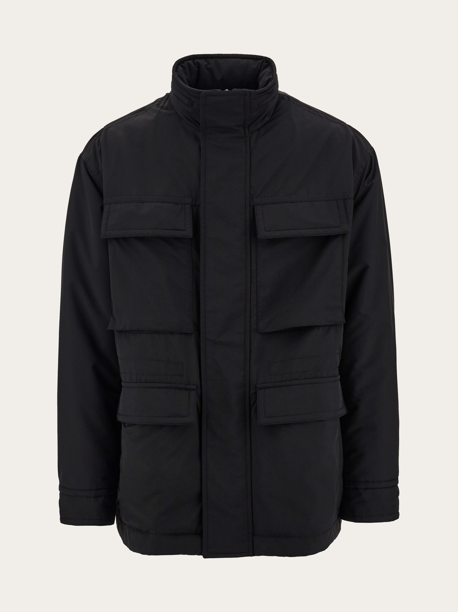 The Caban coat, the Italian equivalent of the beloved peacoat. Revised through the lens of a minimal aesthetic, the cut is clean, with large flap pockets and a high collar. High-fashion elements duet with technical details, such as the heat-sealed zip which opens to reveal inside pockets, and the hidden hood zipped inside the collar. Custom rubber tab at the back of the neck. The inner padding contains FLWRFILL™, a lightweight, bio-based material made using wildflowers and Ferragamo high-quality surplus viscose fabrics, developed in collaboration with PANGAIA and Imbotex. - Composition: 64% pure virgin wool, 36% polyamide - Made in ITALY - Product code: 144852 785752