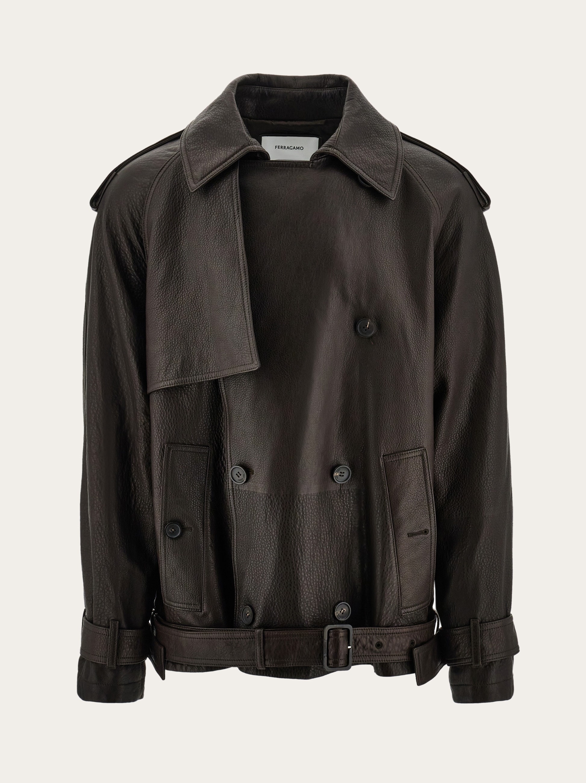 The innovative cut of this jacket takes the trench silhouette to the next level. New hybrid blazer-blouson cut from rich grainy leather. The double breasted line has seventies-inspired lapels, and classic trench elements such as the gun flap, back yoke and button-up wrist straps. - Composition: grainy leather - Made in ITALY - Product code: 144523 783253