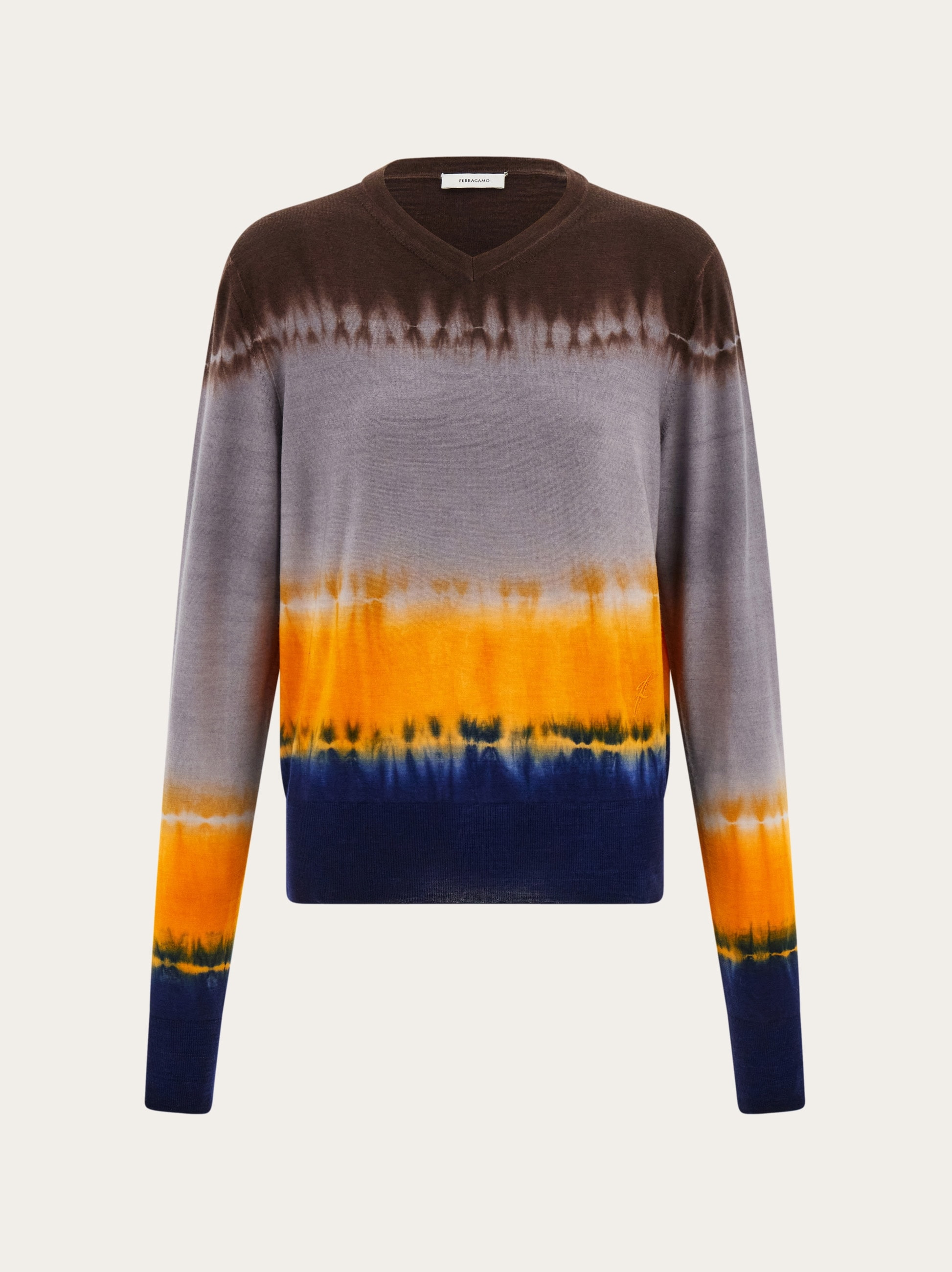 Informal yet refined, this cozy tie dye jumper is a beautiful blend of expert workmanship and original style. Lit up in seasonal hues, the V-neckline and feminine fit echo high end sophistication, with ribbed trims for a contemporary finish. - Composition: 100% pure virgin wool - Model measurements: Height 5' 10"/178 cm; Bust 32 / 81cm; Waist 25"/63 cm; Hips 34½"/88 cm - Model wearing: 38/XS - Made in ITALY - Product code: 13H436 786421