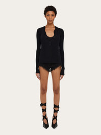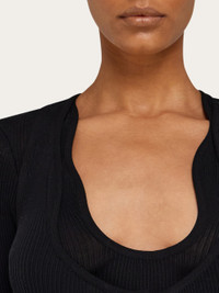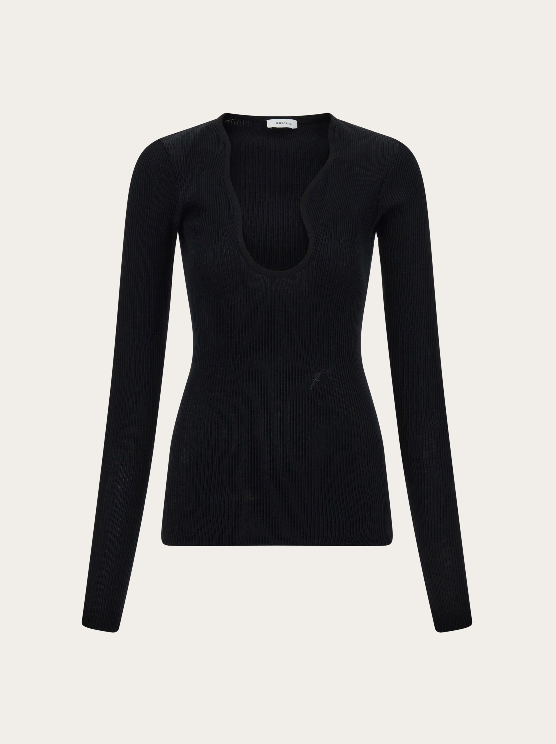 Original outlines with luxurious textures: the vibe of this season's collection. Ribbed cotton long sleeved top with a unique, low cut neckline, complete with tonal embroidery on the left side of the waist. - Composition: 100% cotton - Model measurements: Height 5' 10"/178 cm; Bust 31½ "/80 cm; Waist 23½"/60 cm; Hips 34 "/88 cm - Model wearing: XS - Made in ITALY - Product code: 113261 782752
