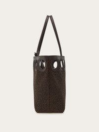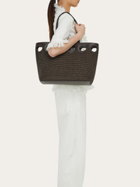 Unmistakably Ferragamo. Cut from calfskin leather, a row of Gancini silhouettes forms the trim of this unique raffia tote. Laid back style with an artisanal flair. - A) Height 11.0 IN B) Length 13.3 IN C) Width 5.5 IN - Composition: raffia and calfskin - Medium - Made in ITALY - Product code: 21A108 783828