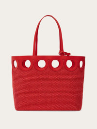 Unmistakably Ferragamo. Cut from calfskin leather, a row of Gancini silhouettes forms the trim of this unique raffia tote. Laid back style with an artisanal flair. - A) Height 11.0 IN B) Length 13.3 IN C) Width 5.5 IN - Composition: raffia and calfskin - Medium - Made in ITALY - Product code: 21A108 783827