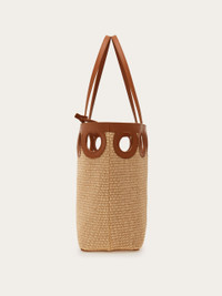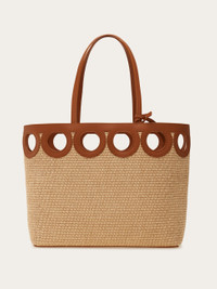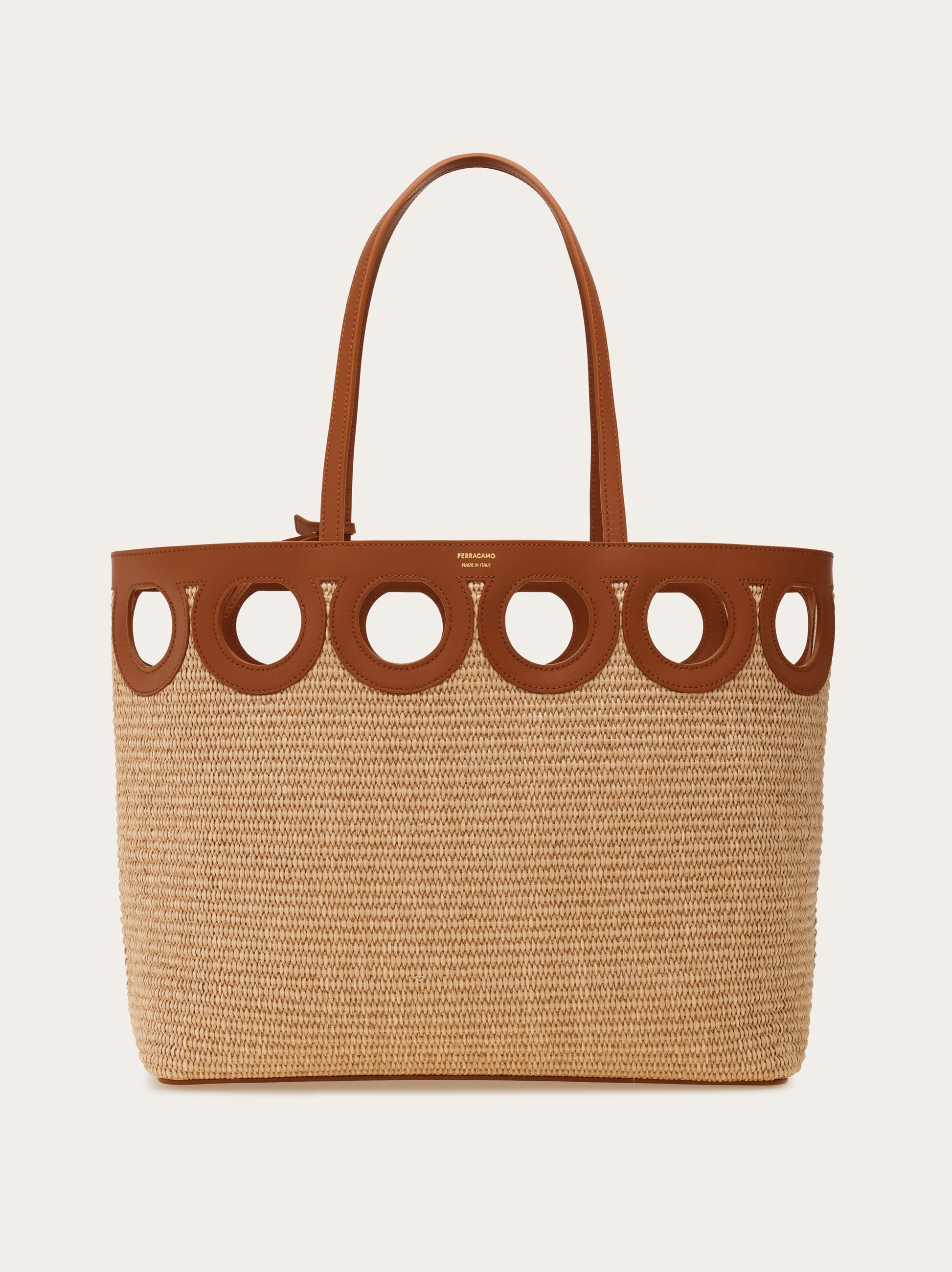 Unmistakably Ferragamo. Cut from calfskin leather, a row of Gancini silhouettes forms the trim of this unique raffia tote. Laid back style with an artisanal flair. - A) Height 11.0 IN B) Length 13.3 IN C) Width 5.5 IN - Composition: raffia and calfskin - Medium - Made in ITALY - Product code: 21A108 783826