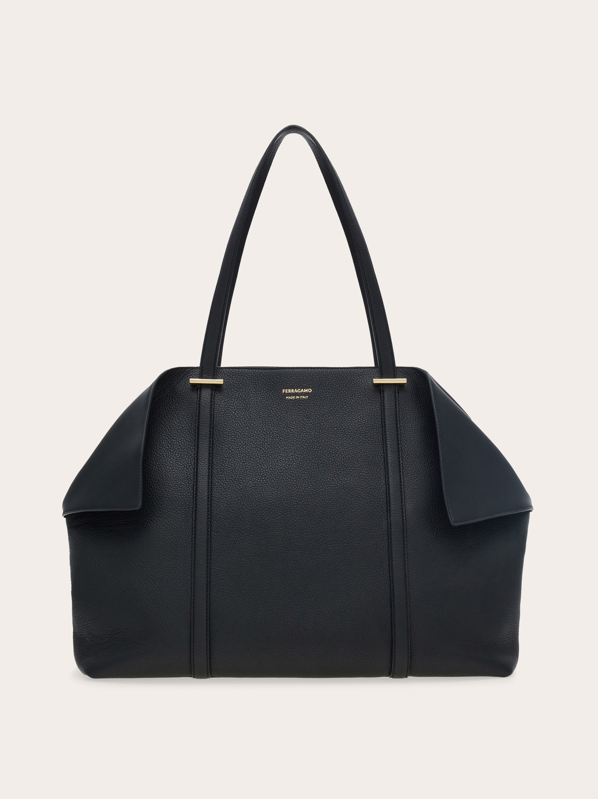 A distinguished edition of the Ferragamo tote, in delicious calfskin leather. The folded sides enhance the rich feel of the fabric, ideal to elevate everyday looks. The leather top handles extend along the front panels, punctuated by a simple rectangular golden clasp. A an embossed logo on the front panel completes the design of this ergonomic hold all that wraps the body perfectly as you move. - A) Height 11.8 IN B) Length 14.9 IN C) Width 7.0 IN - Composition: calfskin - Handle drop: 9.8 in/25 cm - Large - Made in ITALY - Product code: 21A452 789588