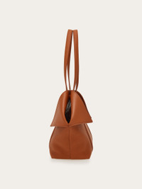 A distinguished edition of the Ferragamo tote, in delicious calfskin leather. The folded sides enhance the rich feel of the fabric, ideal to elevate everyday looks. The leather top handles extend along the front panels, punctuated by a simple rectangular golden clasp. A an embossed logo on the front panel completes the design of this ergonomic hold all that wraps the body perfectly as you move. - A) Height 10.0 IN B) Length 12.4 IN C) Width 5.5 IN - Composition: calfskin - Handle drop: 9.8 in/25 cm - Medium - Made in ITALY - Product code: 21A580 789578