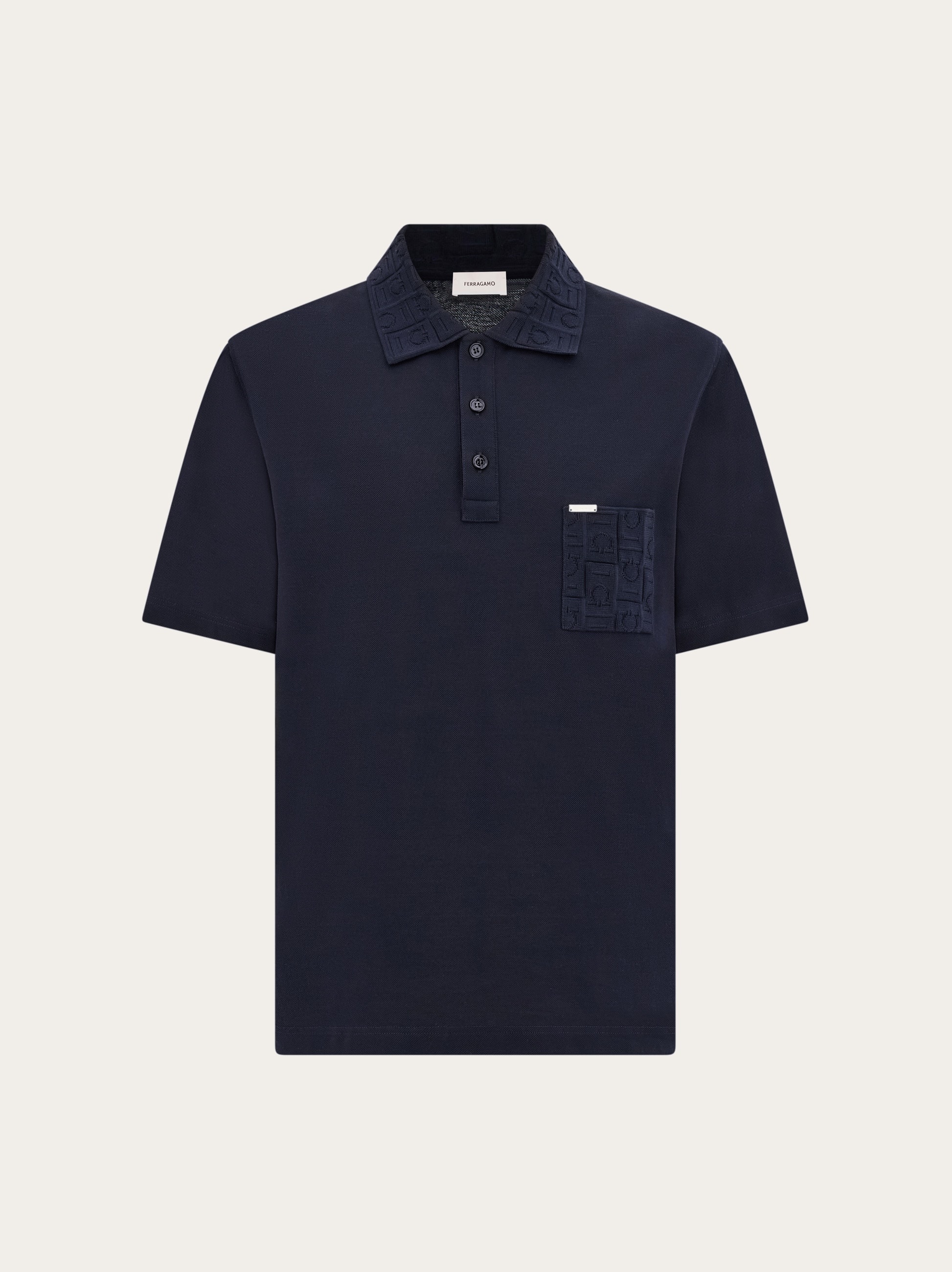The perfect piece for smart-casual looks, Ferragamo style. This short sleeved cotton pique jersey polo shirt is elevated by a tonal jacquard monogram on the collar and applied chest pocket. The workmanship is unmistakable, and punctuated by a button up collar and custom metal tab above the pocket. - Composition: 100% cotton - Made in ITALY - Product code: 122611 781014