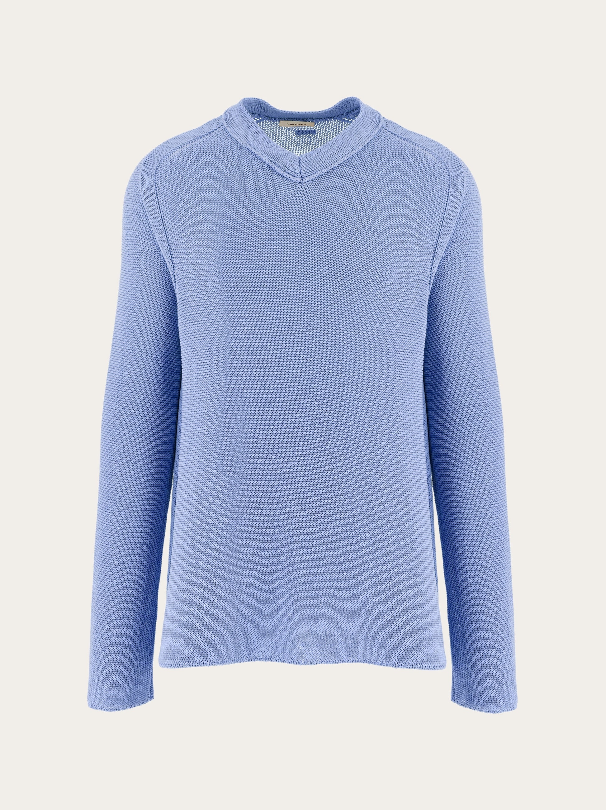 Cool evolution of the V-neck sweater, made of fluid viscose and cotton yarn. The inverted workmanship emphasises fine details such as the connecting socks and the inverted hem along the neckline. The fit is regular on the bust, with straight bottoms for a more contemporary look. Small customised metal tag on the back. - Composition: 56% viscose, 44% cotton - Made in ITALY - Product code: 122331 781613