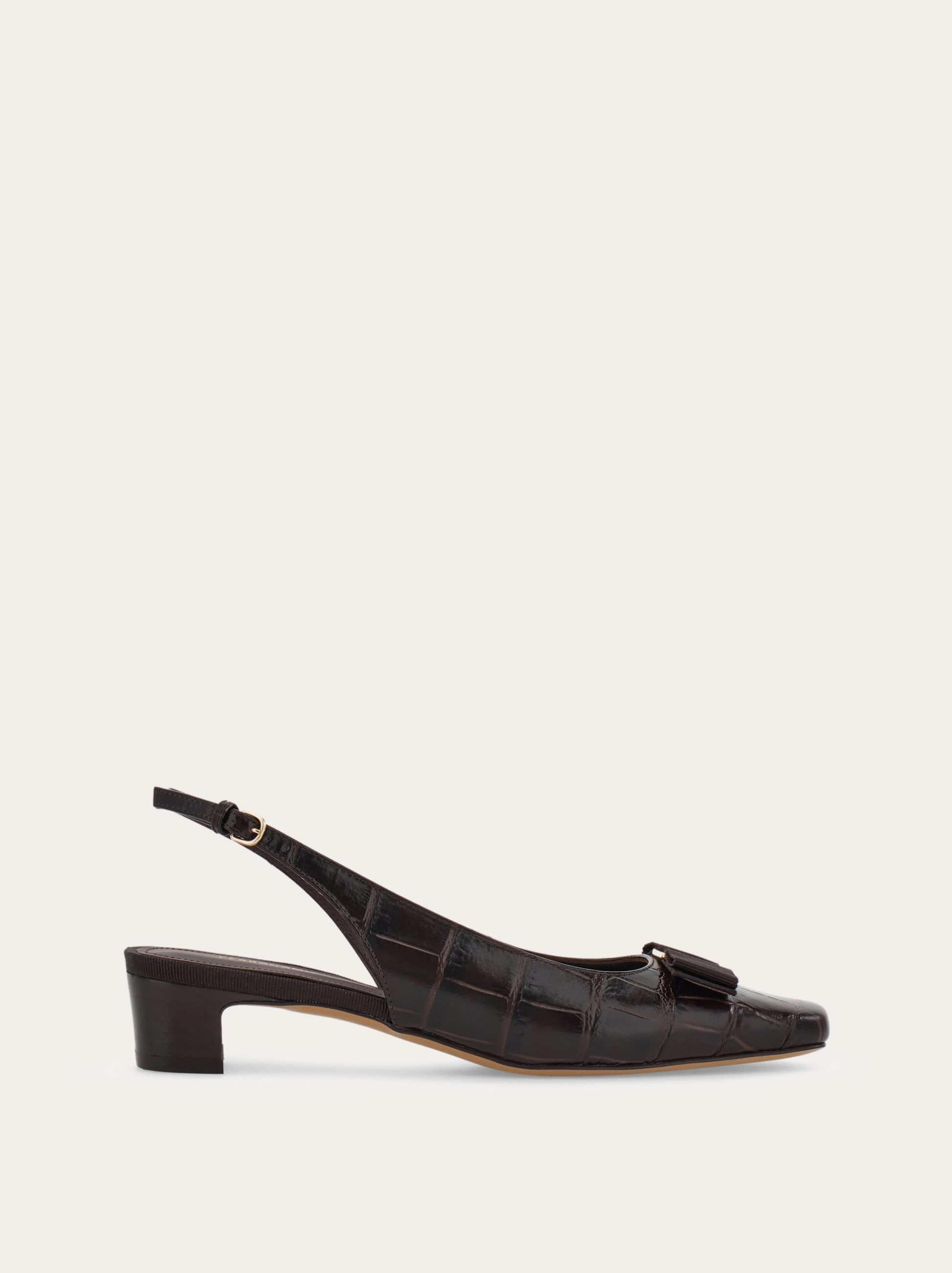 A new contemporary icon; this chic slingback in alligator printed calfskin is simply perfect for the modern lady. With a 3cm heel and elasticated slingback strap, the fit is easy and comfortable, while the leather insole and covered heel match the color of the grosgrain bow, held by a slim signature buckle at the tip. - Composition: printed calfskin - Made in ITALY - Product code: 01J702 779859