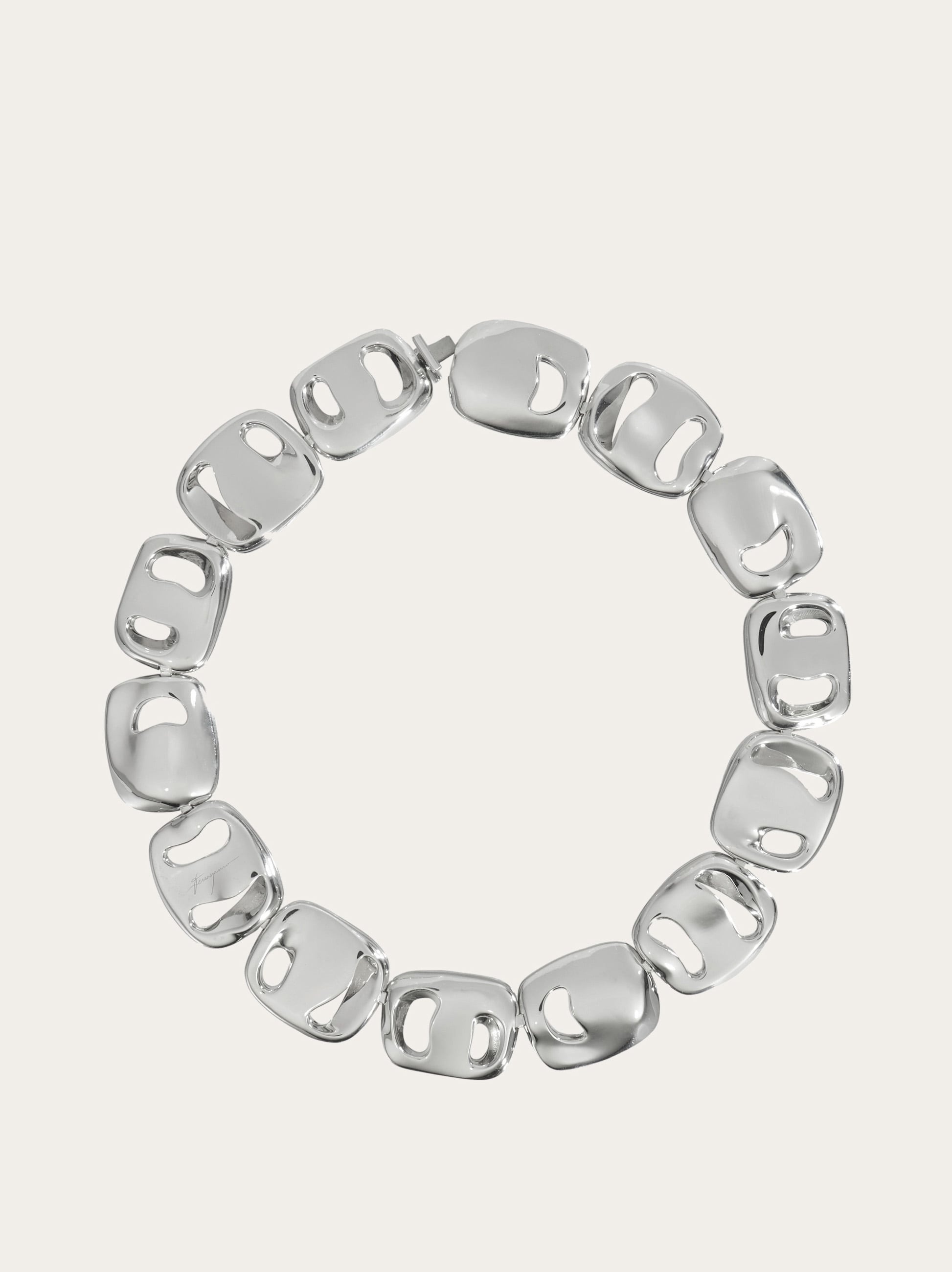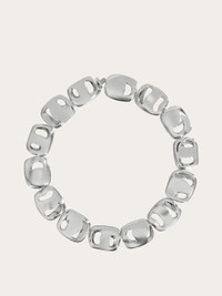 A lunar glow that lights up the face: a new silver choker composed of organic elements with shapes inspired by Vara buckles. The hidden fastening enhances its elegant mood. The rhodium-plated finish ensures shine and durability, with an anti-oxidation effect. - length 15.7 IN - Composition: 100% silver - Made in ITALY - Product code: 780033 780661