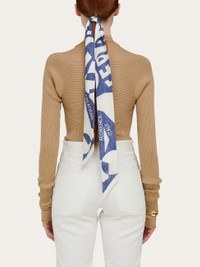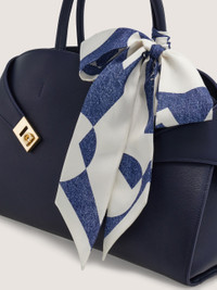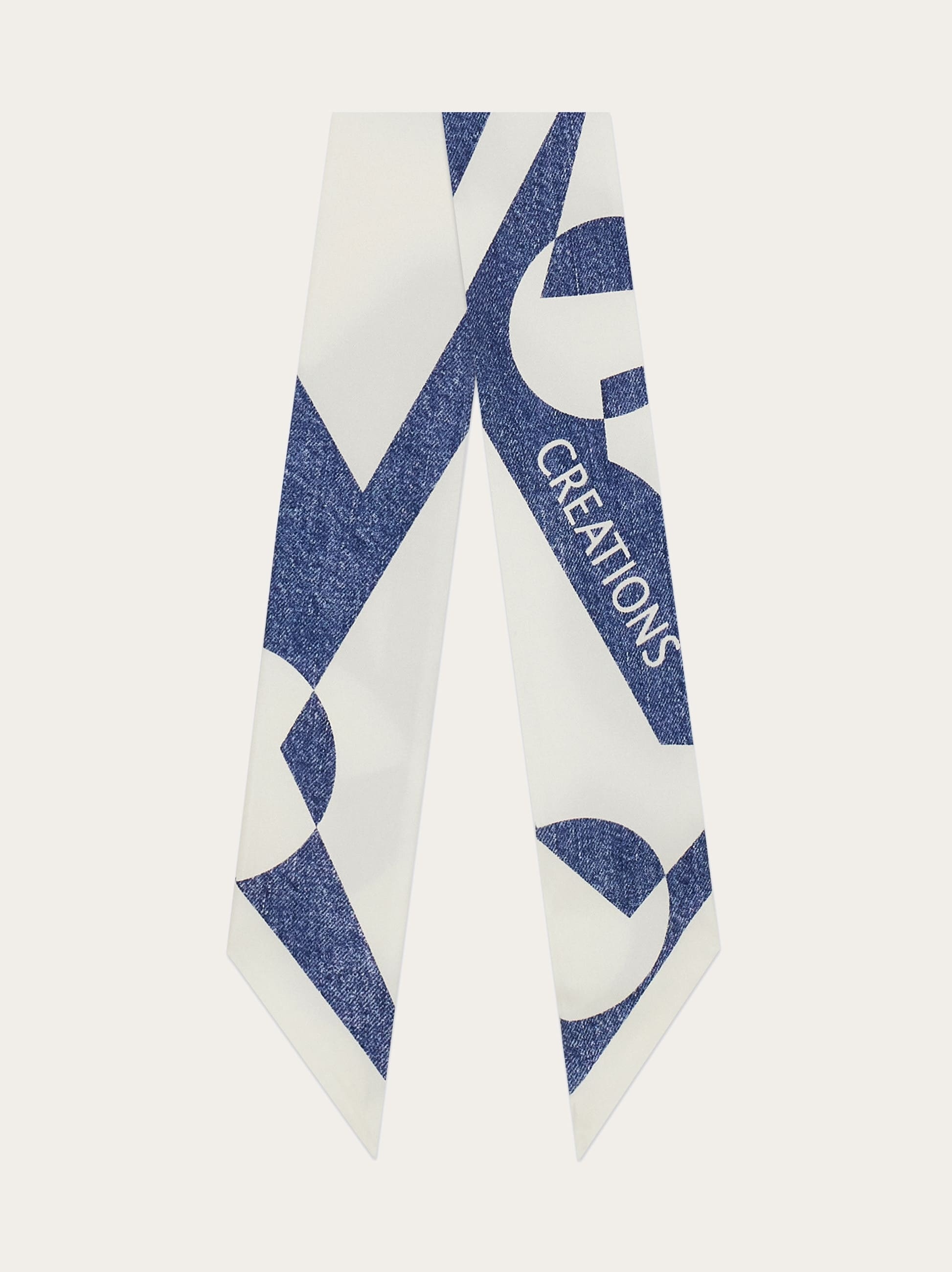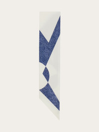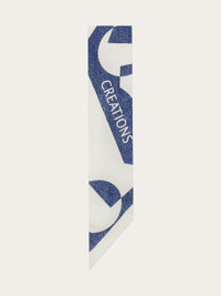 A most versatile accessory, the silk bandeau can be worn in your hair, around your neck, as a belt, or used to decorate your bag; the options are endless! This iteration is decorated with the Venna print, a stylized logo designed by artist Lucio Venna for Ferragamo in the 1930's. - length 55.1 IN width 2.7 IN - Composition: 100% silk - Made in ITALY - Product code: 321116 784122
