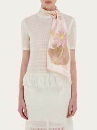 A most versatile accessory, the silk bandeau can be worn in your hair, around your neck, as a belt, or used to decorate your bag; the options are endless! This iteration is decorated with the Water lily motif. - length 62.9 IN width 7.8 IN - Composition: 100% silk - Made in ITALY - Product code: 321238 790150