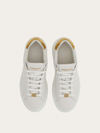 Nineties inspiration and clean lines define this new Ferragamo sneaker. The smooth calfskin upper features a reptile print strip with a golden finish for a touch of glam. A buckle runs through the laces, and the ultra-light rubber sole has a platform wedge with embossed signature. Leather insole. - Composition: calfskin - Made in ITALY - Product code: 030573 769352