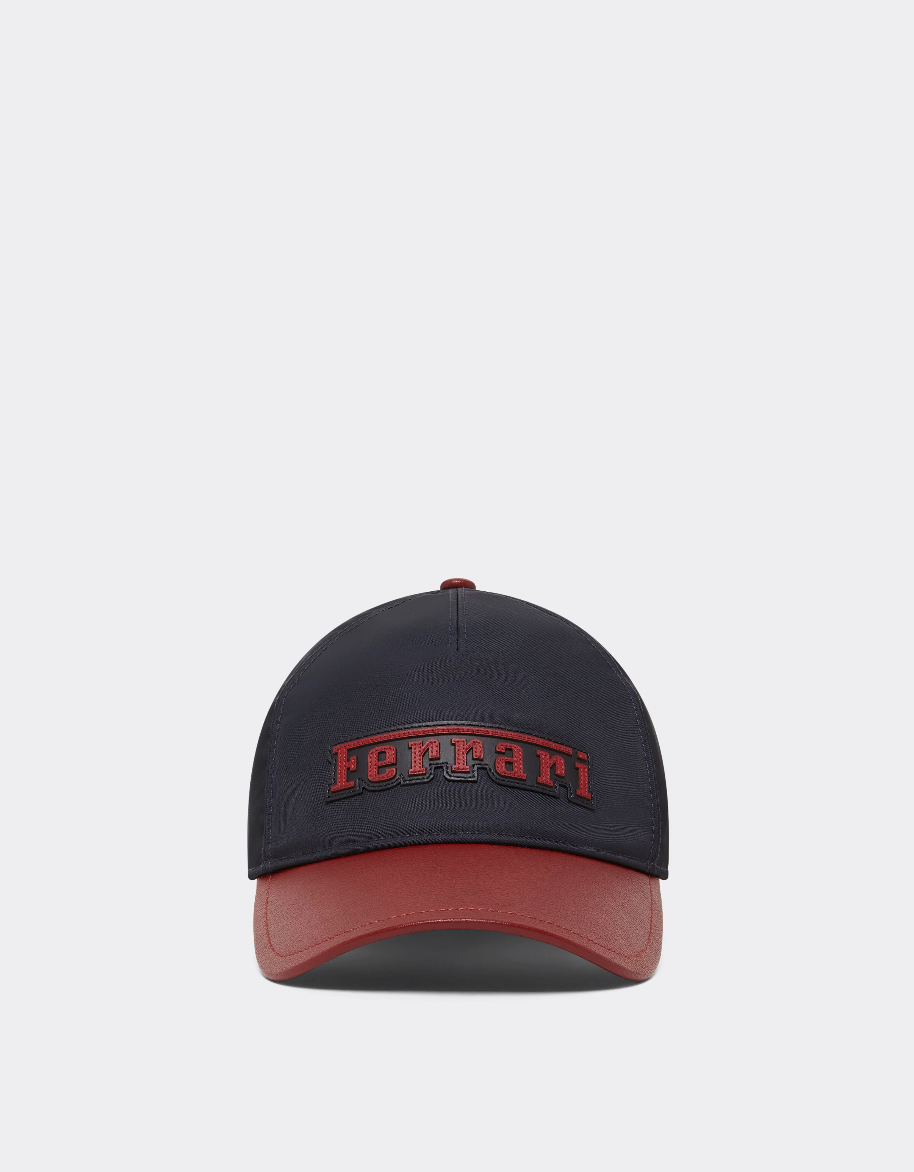 Baseball cap made from a refined mix of materials, with a navy blue Q-Cycle® nylon crown and contrasting Maison red leather visor. The alternating textures and colors evoke the energy of the 2025 Las Vegas Grand Prix, the inspiration for the capsule collection. The "Ferrari" lettering embroidered in leather on the front and the exclusive patches on the sides define the iconic character of this Made in Italy accessory, with its bold and contemporary design. DETAILS - Las Vegas Capsule Collection - Velcro closure with leather flap and embroidered Ferrari logo - Leather visor - Tone-on-tone stitching - Inner grosgrain ribbon - Custom Ferrari red fabric lining - Embroidered patch on the front Side patches - Ferrari leather logo patch Size 58 cm MATERIALS PR: PA-TE:100.0 SC: *LEATHER* OVIS ARIES:100.0- Product Code: 51166f101