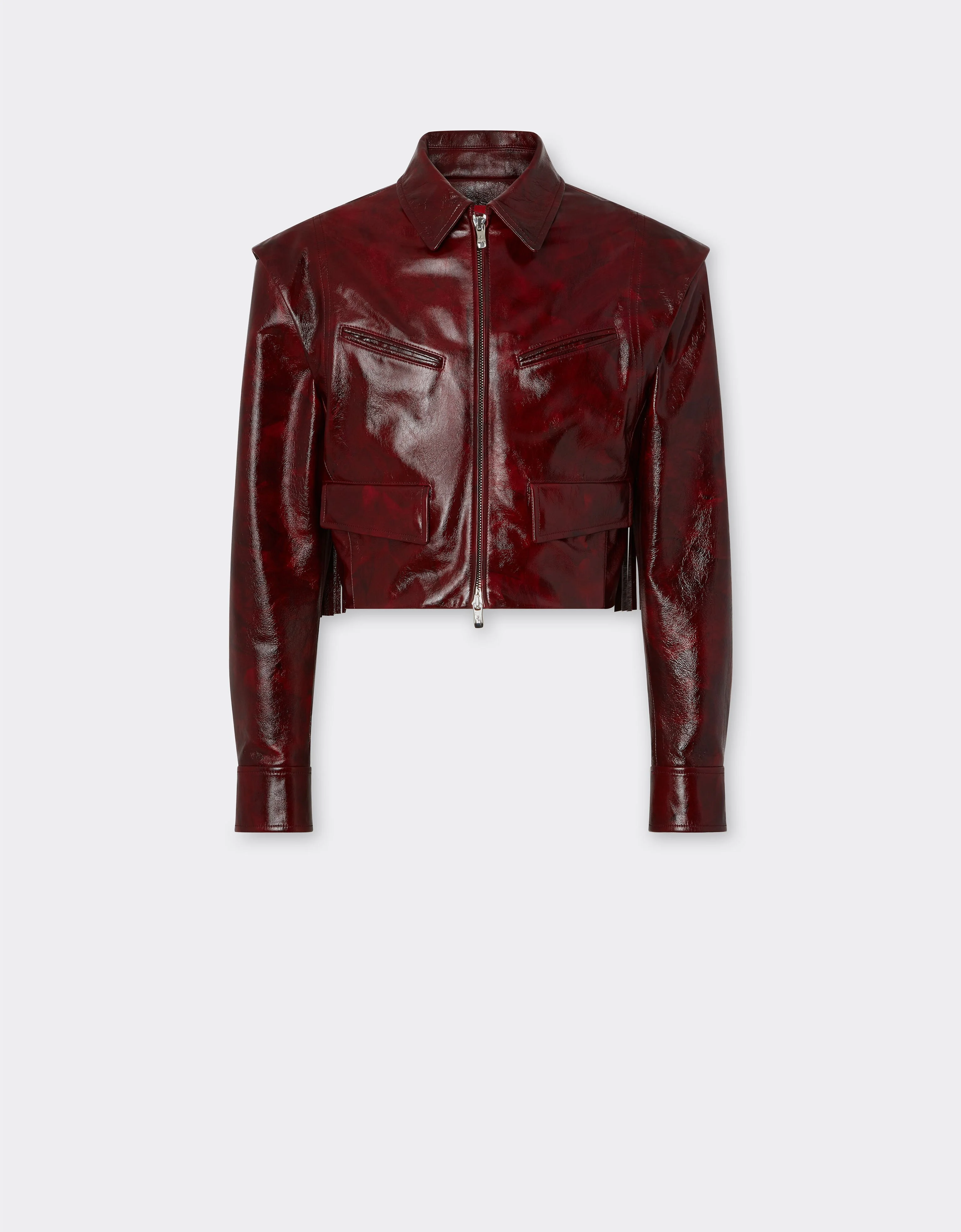 Blouson in brushed nappa leather, handcrafted to enhance its material texture. The item features a front zip fastening and gussets at the armholes, and is enhanced with a rear yoke with red flowing nappa leather fringes, emblematic of bold and dynamic elegance. This Italian-made garment is further enhanced with the iconic Ferrari insert in leather with tonal contour at the back. DETAILS - Regular fit - Cropped silhouette - Shirt collar - Zip fastening with branded zip puller in palladium galvanic metal - Sleeve with gusset at the armhole, elbow patch, and zip at the cuff - Front flap pockets - Double welt breast pockets - Ferrari insert at the back MATERIALS PR: LAMBS LEATHER-VA:100.0 Product Code: 49700f163