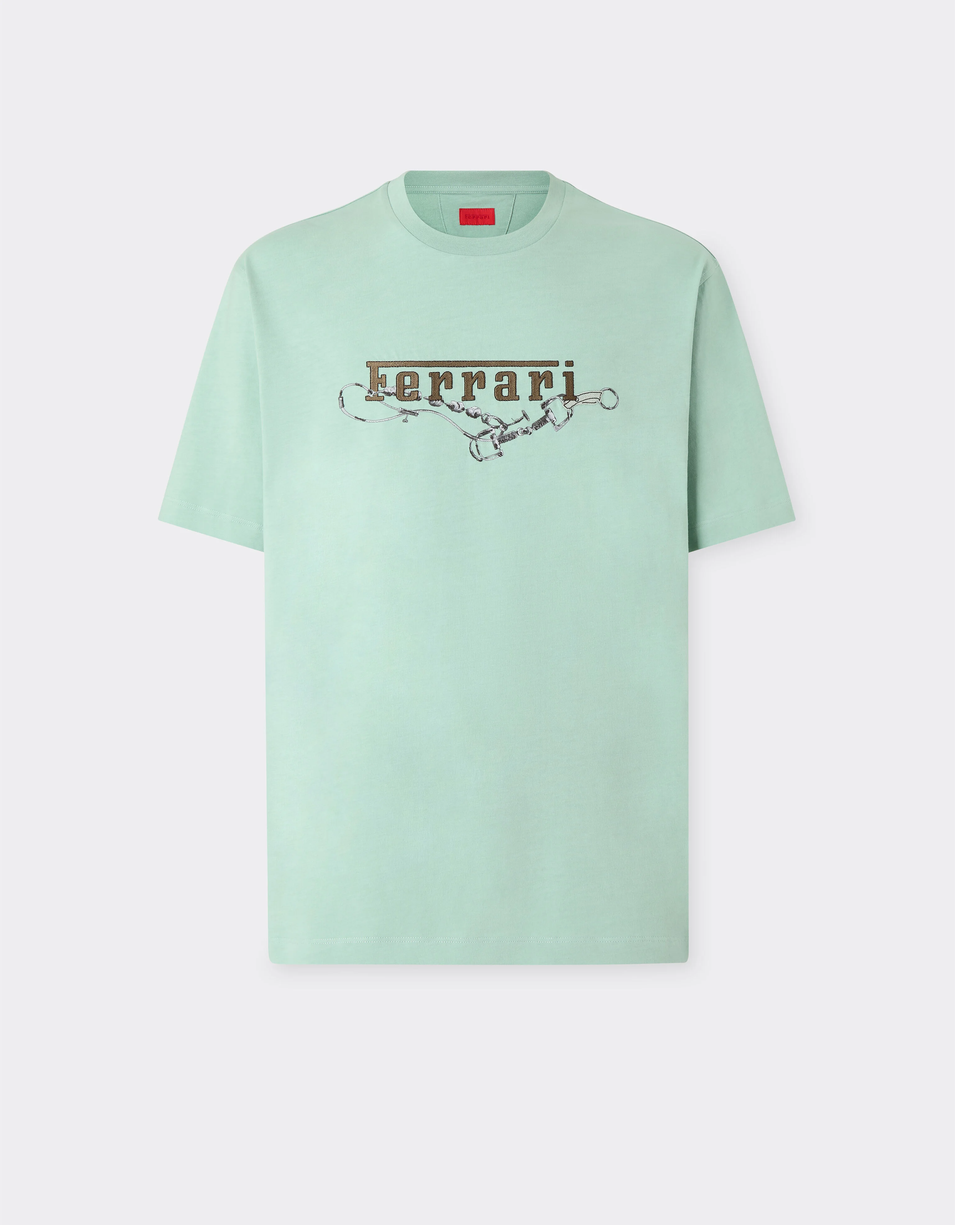 Crew neck T-shirt featuring the Ferrari logo embroidery on the front intertwined with a printed chain and embroidered shadows. The embroidered insert adds a further iconic touch to this garment Made in Italy from pure cotton. DETAILS - Crew neck - Short sleeves - Embroidery with Ferrari print MATERIALS PR: CO-TE:100.0 Product Code: 50838f179