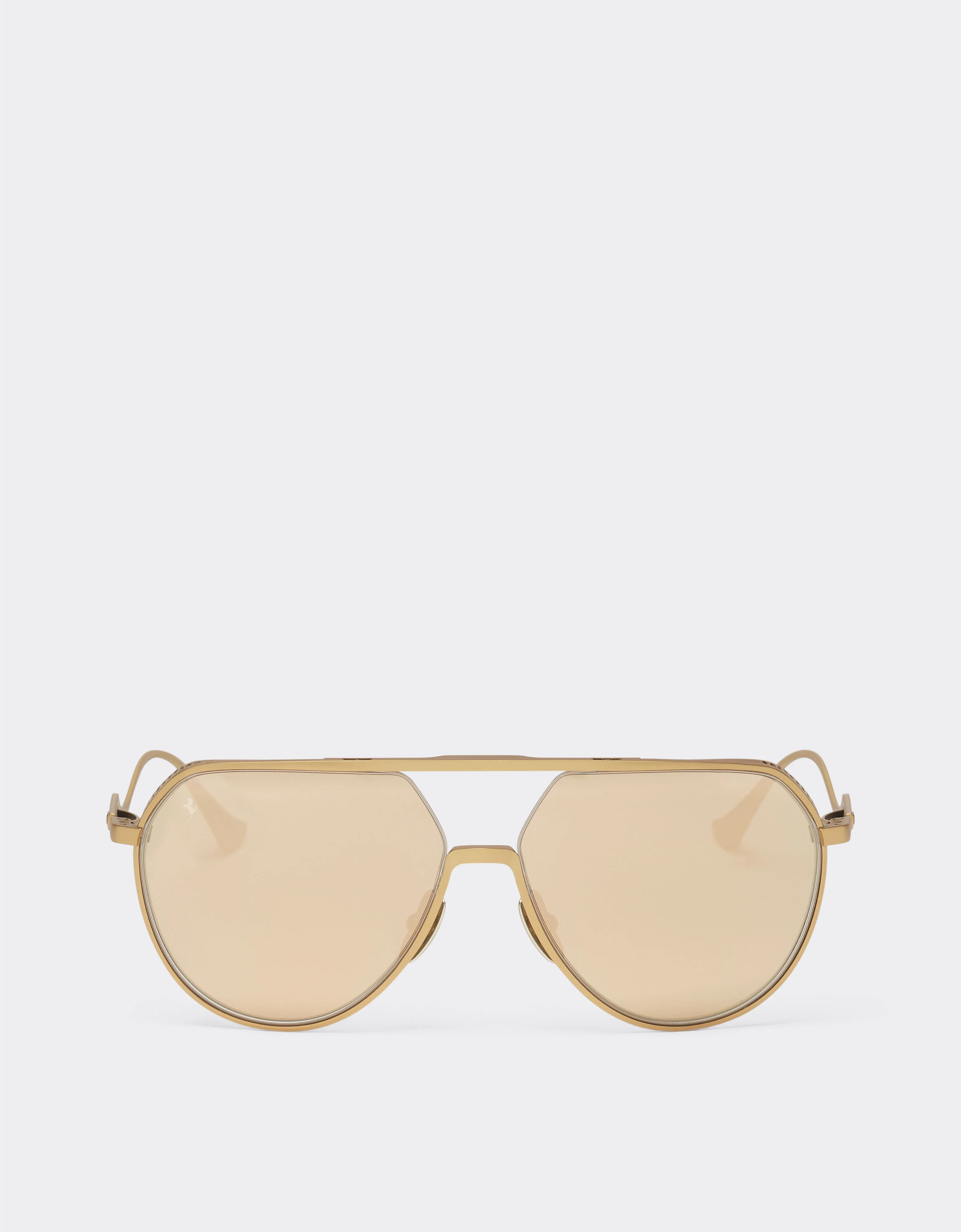 Sophisticated style and cutting-edge construction technologies meet in these sunglasses with titanium frame made in Japan. The classic aviator model is here reinterpreted by inserting a perforated spoiler, to add depth and character. The temples feature a sinuous profile as well as the innovative ?T Flex Ferrari hinge in titanium. Synonymous with lightness, flexibility and extraordinary durability, this element ensures a fluid movement and is custom-made to perfectly integrate within the design. DETAILS - Aviator shape - Titanium - Frame colour: matt gold - Temple colour: matt gold - Lens: gold mirror yellow - Lens and bridge length: 59/16 mm - Length: 145 mm - ?T Flex Ferrari hinge in titanium - Suitable for multifocal lenses - Prancing Horse on the lens - Ferrari logo on the temple tips - Exclusive packaging with custom box, case, pouch and microfibre cloth MATERIALS PR: ME-VA:100.0 Product Code: LA02Of141