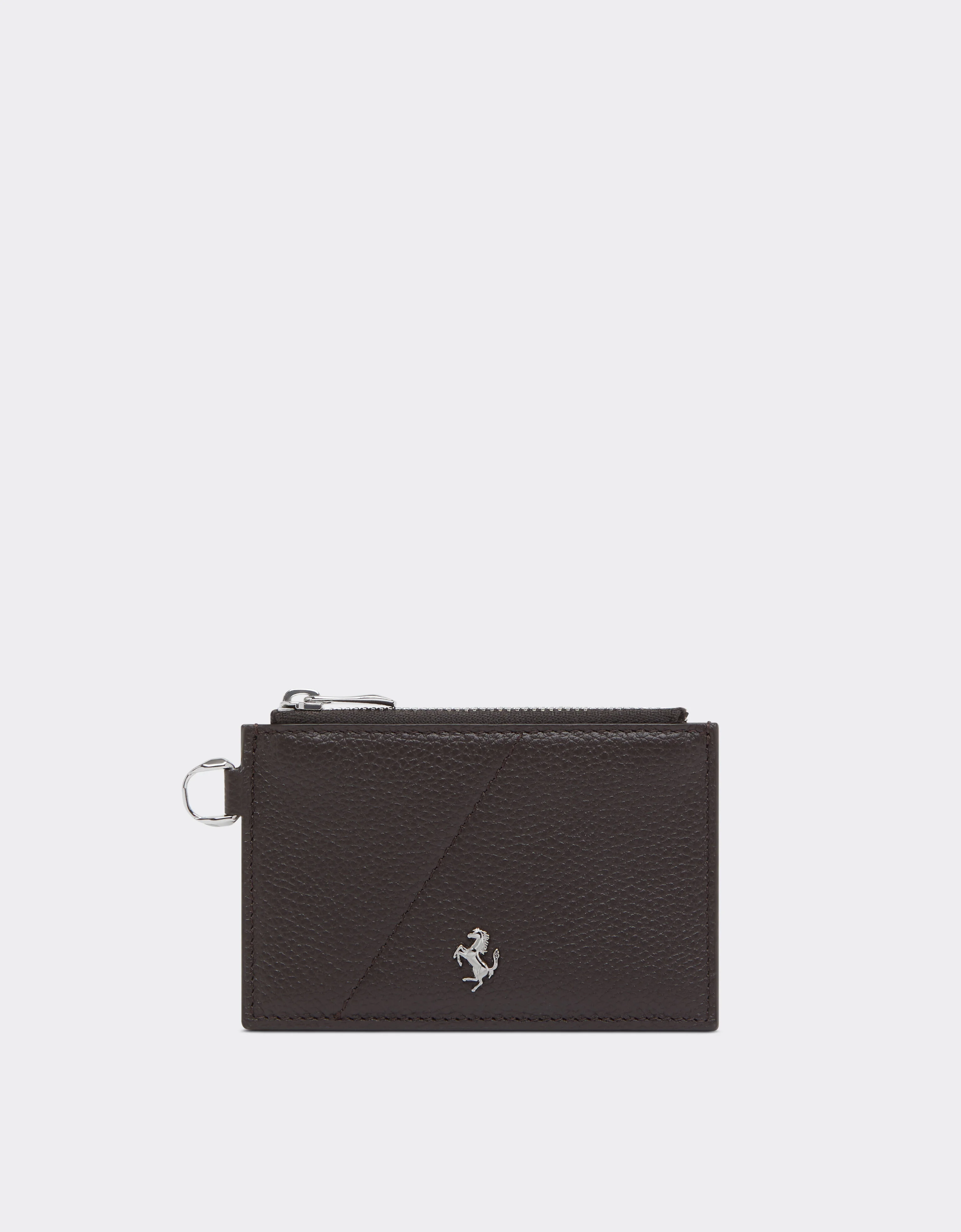 Grained leather card holder featuring a sophisticated diagonal pattern with embossed stitching and a slight curve that enhances the volume. The top zipped pocket stores essentials, while the four back pockets hold cards and notes. A compact accessory that combines functionality with contemporary sophistication. DETAILS - Metal zip pocket - Metal Prancing Horse - Diagonal stitching pattern - Four card compartments - Dimensions: 11 cm (W) x 7 cm (H) x 1 cm (D) MATERIALS PR: BOS TAURUS-VA:100.0 Product Code: 50624f38