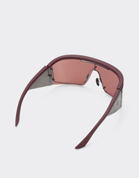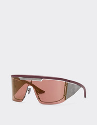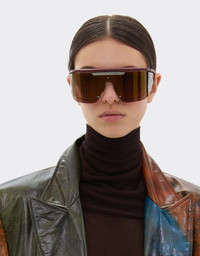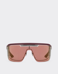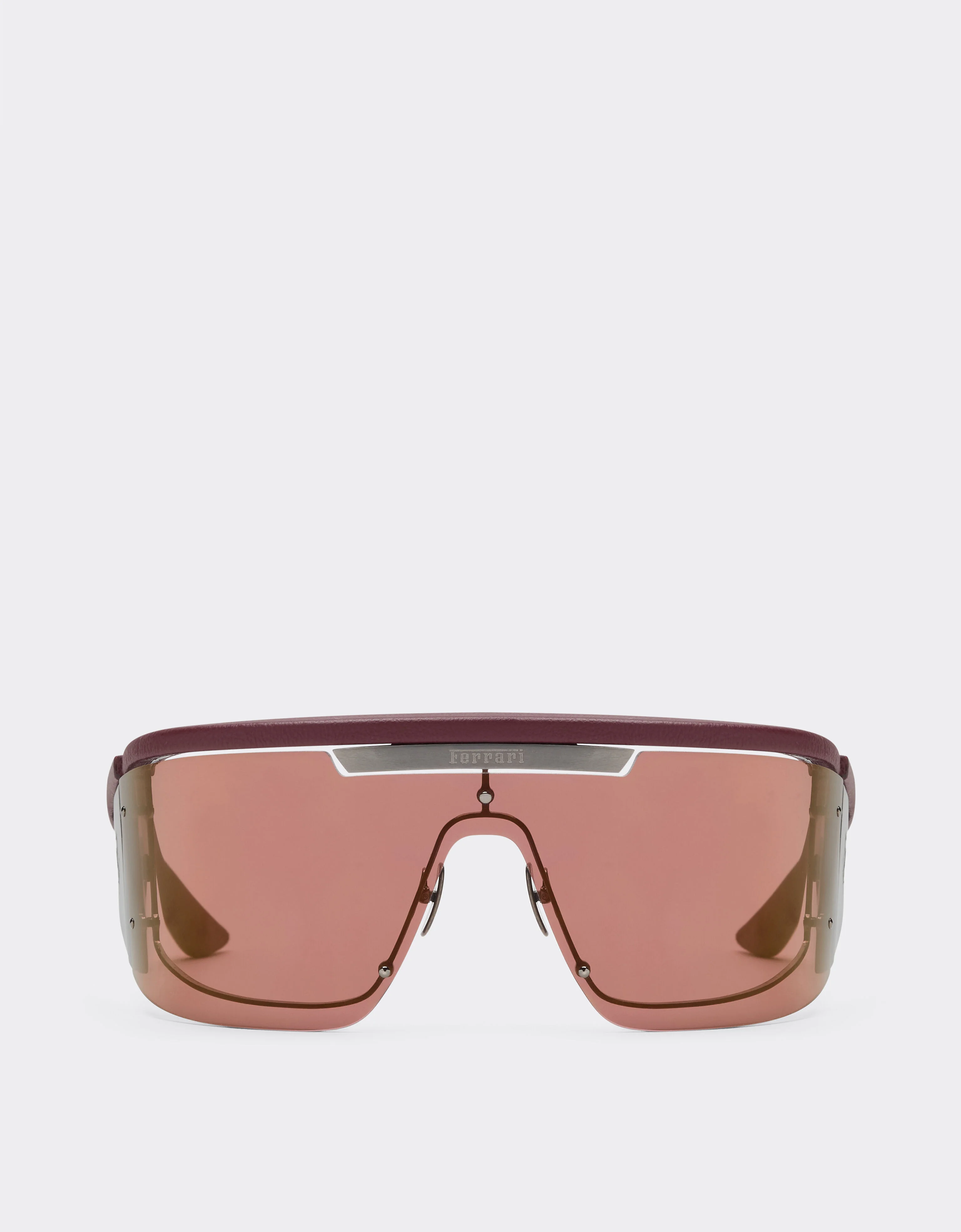 The Limited Edition sunglasses, which appeared on the catwalk during the Ferrari FW25 fashion show, combine sculptural volumes and fine materials in a design that recalls the universe of the Maranello company's cars. The single lens rests on an elegant metal frame and is framed at the top by a three-dimensional leather-covered edging, which wraps around the front and extends in continuity over the temples. The profile is enhanced by a triangular metal element , engraved with the Prancing Horse emblem, which underlines the exclusive character of the model. An expression of Made in Italy craftsmanship, the accessory blends iconicaesthetics and refined technical solutions, and is embellished by the metal detail with engraved Ferrari logo. DETAILS - Frame shape: irregular . - Frame shape: rectangular . - Metal frame covered in leather - Frame color: brushed gunmetal and leather dark red - Mask color: dark red - Length of temples: 135 mm - Front Ferrari logo - Lateral Prancing Horse . - Not suitable for graduated lenses - Exclusive packaging with custom box, leather pouch and microfiber cloth - Limited Edition card MATERIALS PR: ME-VA:100.0 Product Code: LA0F5f46