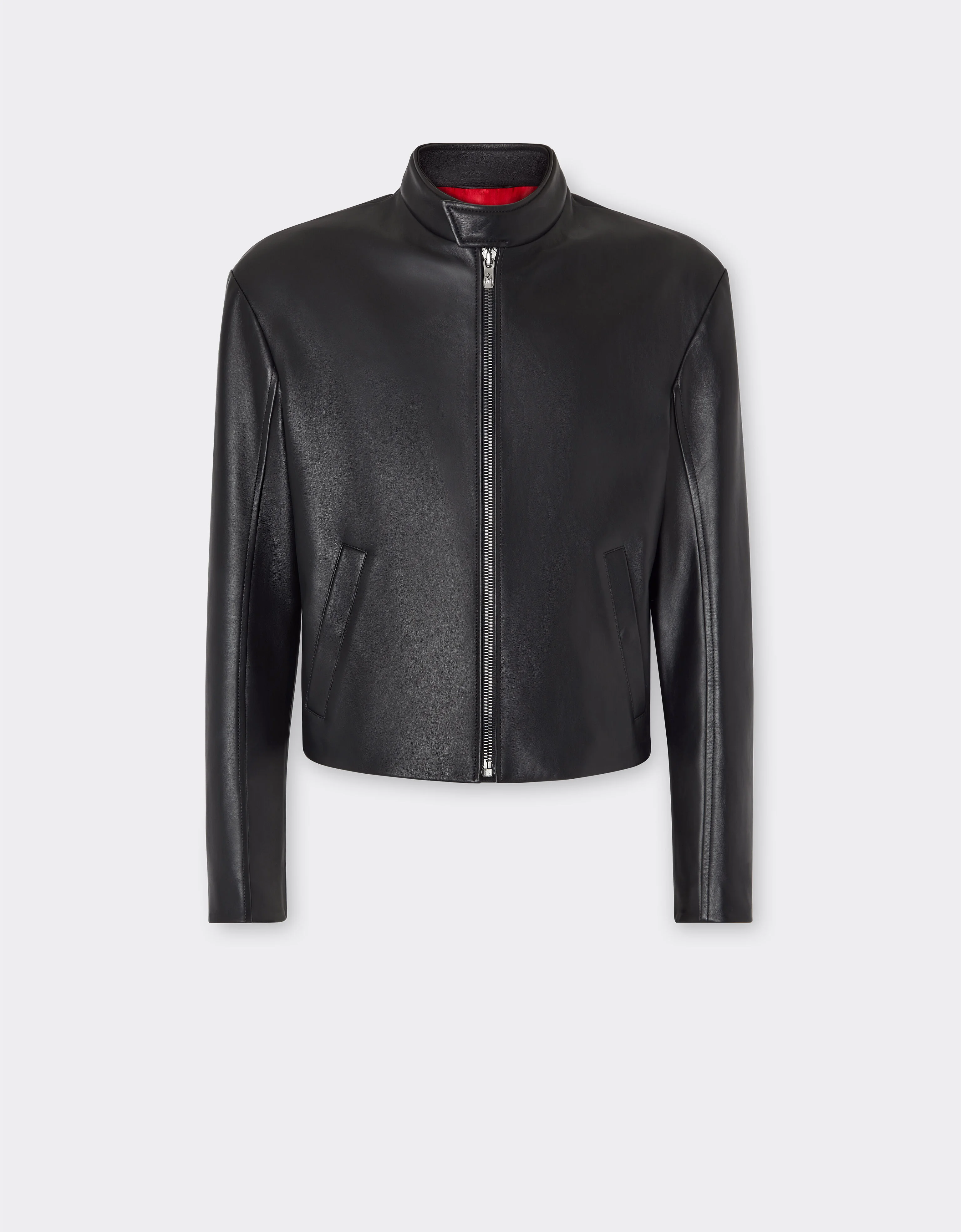 Biker jacket in soft nappa leather, with a comfortable fit thanks to the stretch inserts on the sides. The stand-up collar and zips on the front and cuffs define the contemporary lines of this Made in Italy model, signed on the back by the iconic Ferrari rear window in leather with red trim. DETAILS - Regular fit - Stand-up collar with concealed snap button - Front closure with ruthenium-finished metal zipper - Stretch leather side panels - Front welt pockets with concealed snap button closure Ferrari rear window on the back - Custom Ferrari red lining MATERIALS PR: 100%LAMB SKIN Product Code: 21639f01