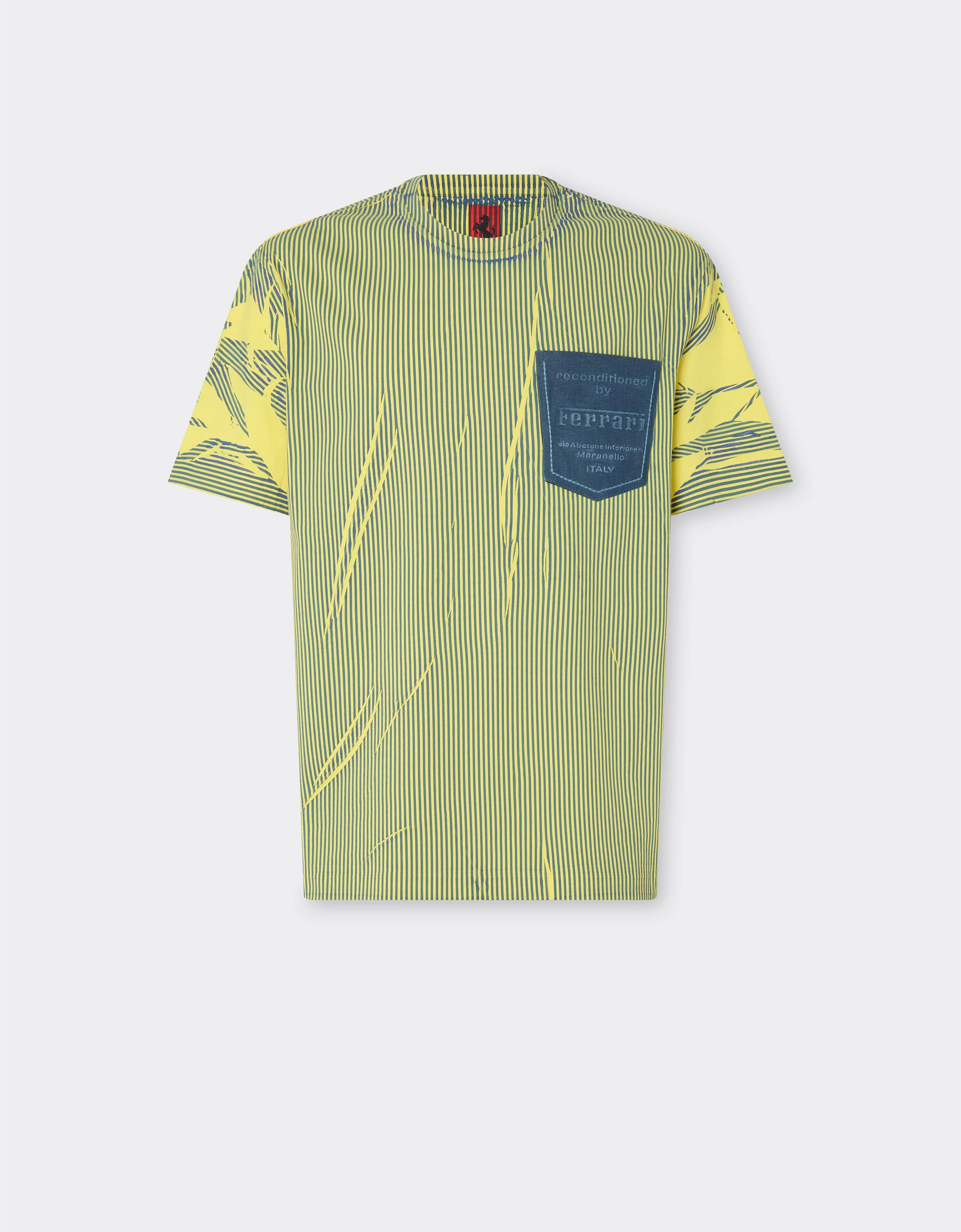 Solid-colour cotton T-shirt revamped using the overprinting technique – a signature style in the Reconditioned by Ferrari collection, the upcycling project created to extend the life cycle of existing resources and reduce environmental impact from newly made products. This Italian-made garment’s essential design is completed with the printed logo on the chest and the patch denim pocket, combining contemporary aesthetics with attention to sustainability. DETAILS - Made in Italy - Reconditioned by Ferrari collection - Crew neck - Short sleeves - Patch denim pocket with “Reconditioned by Ferrari via Abetone Inferiore 4 Maranello Italy” written on it MATERIALS PR: CO-TE:100.0 Product Code: 49908f97