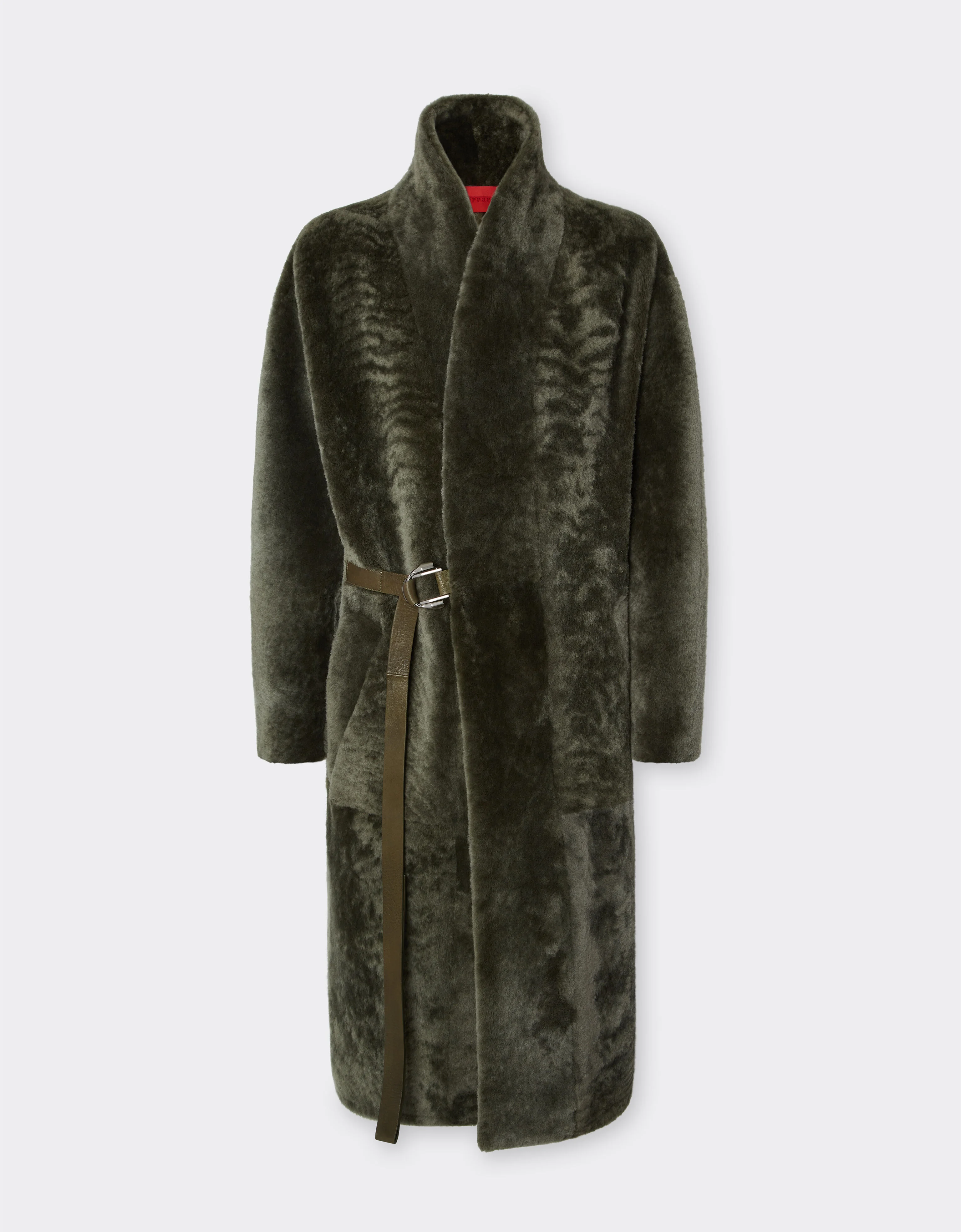 Wrap-around and textural, this shearling coat with astrakhan effect stands out for its visible fur and unlined suede interior to enhance its fine nature. The oversized design is characterised by a wide shawl collar, single-breasted fastening and fixed leather belt with custom D-ring. The piped pockets and the seasonal livery embroidered on the back complete this Italian-made garment with iconic details from the collection. DETAILS - Oversized fit - Mid-calf length - Fur exterior - Suede interior - Wide shawl collar - Fastening with fixed belt with custom D-ring and snap button in palladium galvanic metal - Ergonomic sleeves - Side pockets with piping - Livery pattern at the back MATERIALS PR: LAMBS LEATHER-VA:100.0 Product Code: 49245f166