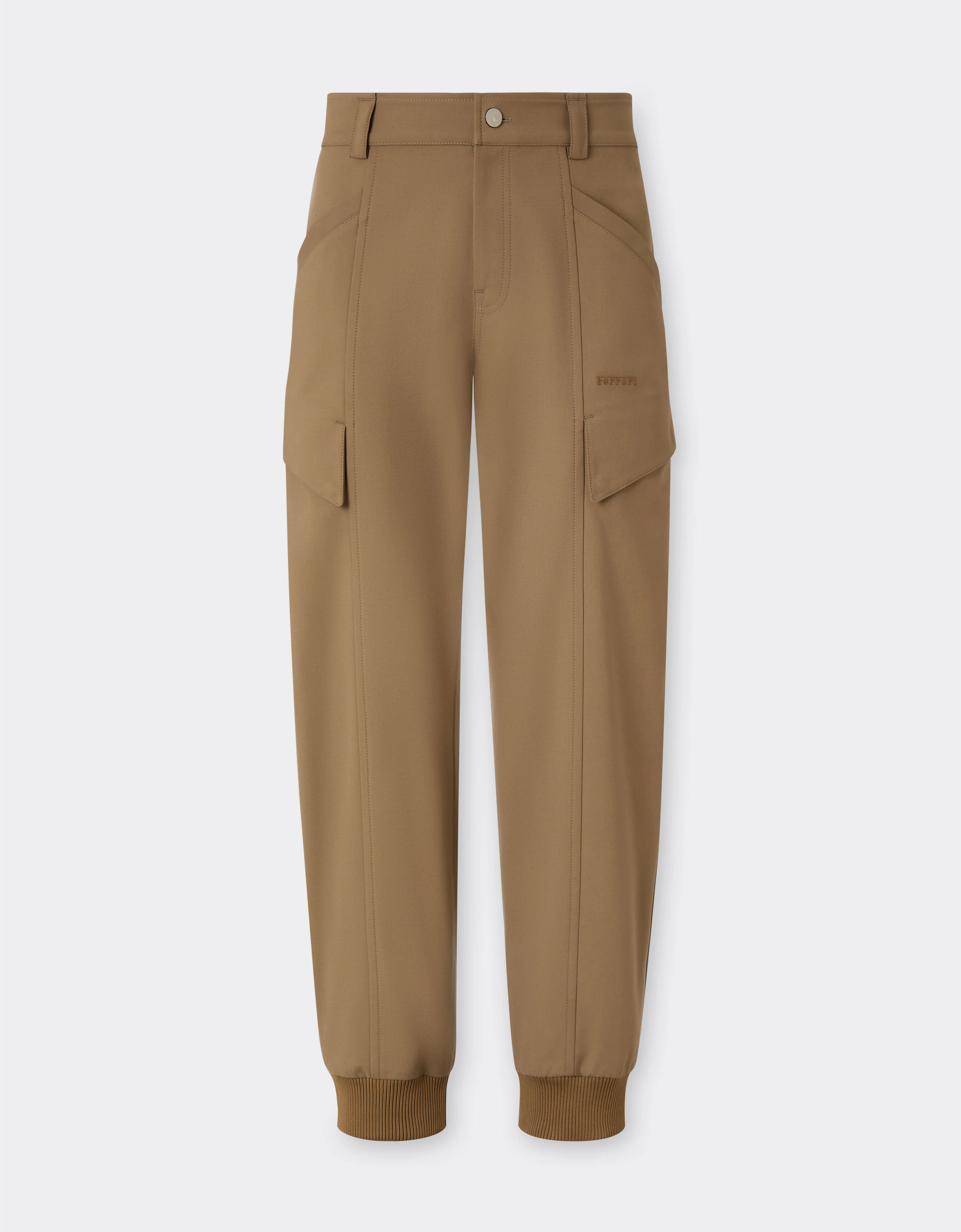 These cargo pants, crafted from a special cotton blend, boast a clean, minimalist design. The comfortable leg that tapers to a cuff, the contoured pockets, and the Ferrari rear window focus on form and function, while the technical cotton gives the piece a bold, modern feel. DETAILS - Regular fit - Slightly wide leg with elasticated knit bottom - Mid-rise with belt loops - Central rear loop with Ferrari rear window - Front fastening with stud button and customised palladium-plated metal zip - Side funnel pockets - Welt pockets on the back - Large pockets with shaped flap on the leg - Ferrari logo embroidered on the flap of the left pocket MATERIALS PR: CO-TE:54.0 Product Code: 50354f177