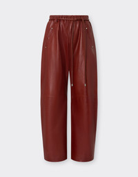 Relaxed lines and structure coexist in these bold trousers, adjusted by a drawstring at the waist. The leather with a distinctive pull-up effect accompanies movement, revealing a natural depth. Wear with the top in the same material for a coordinated look with a strong impact. DETAILS - Comfortable fit - Elasticated waist with leather drawstring - Slash pockets on the sides with screw-shaped rivets - Back pockets with concealed closure - Custom Ferrari red lining - Palladium-plated metal details MATERIALS PR: GOAT LEATHER-TE:100.0 Product Code: 50936f186