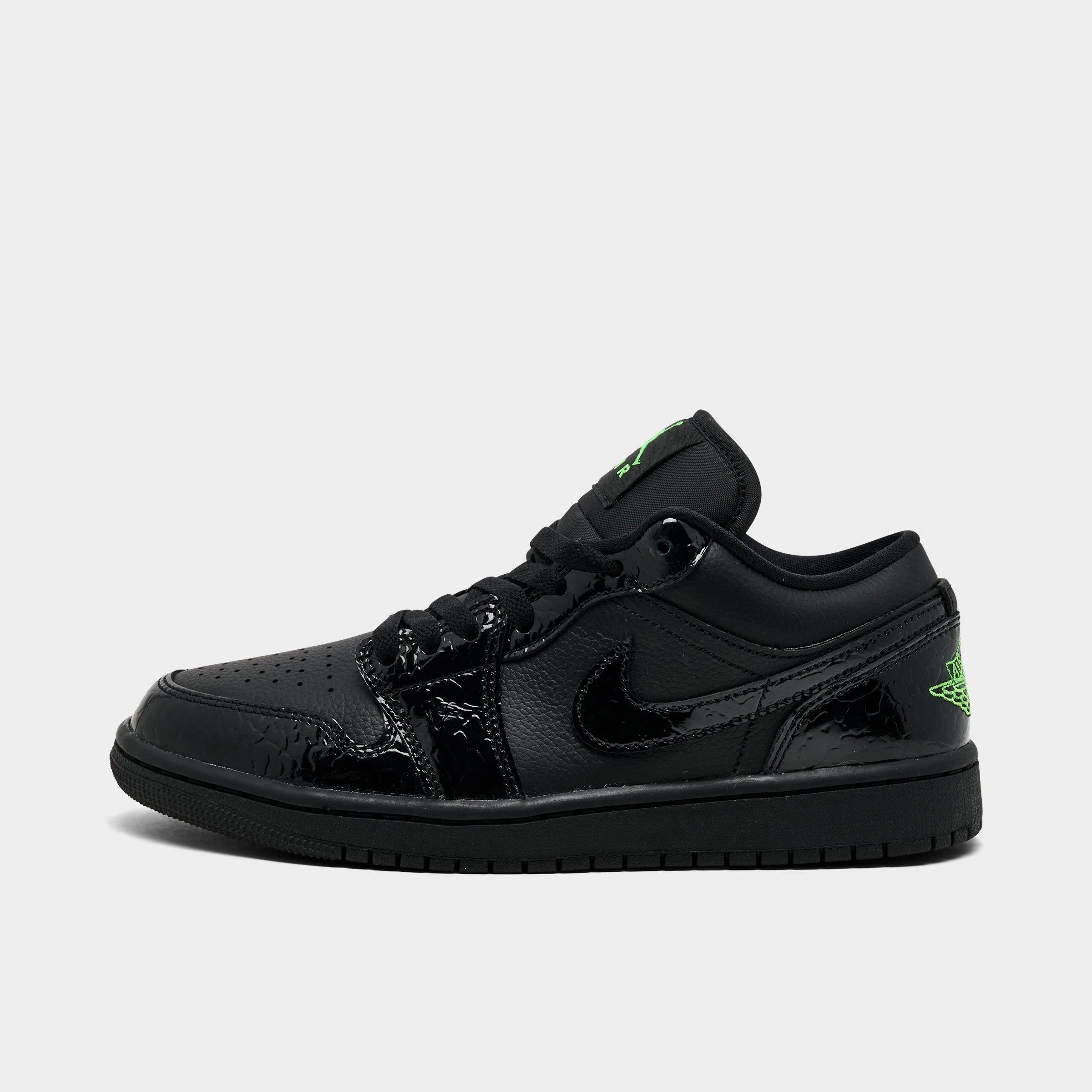 - Low-top AJ1 silhouette - Full leather upper - Color-accented, embroidered Jumpman on the tongue and Jordan Wings logo on heels for heritage style - Croc-embossed print overlays with patent leather heel detail delivers a distinctive look - Encapsulated Air-Sole unit provides long-lasting cushioned comfort - Foam midsole offers lightweight cushioning - Classic lace closure secures the fit - Durable rubber outsole with a herringbone pattern for reliable traction and grip on and off court - The Air Jordan 1 Low SE is imported. Creep through city streets in signature Jumpman style when you lace up these reptilian-inspired Women's Air Jordan 1 Low SE Casual Shoes. Crafted with full leather uppers, this textured twist on the AJ1 silhouette features 3D croc-embossed overlays, patent leather heels, and color-accented Jordan Wings branding—a luxe design with a stealth aesthetic.