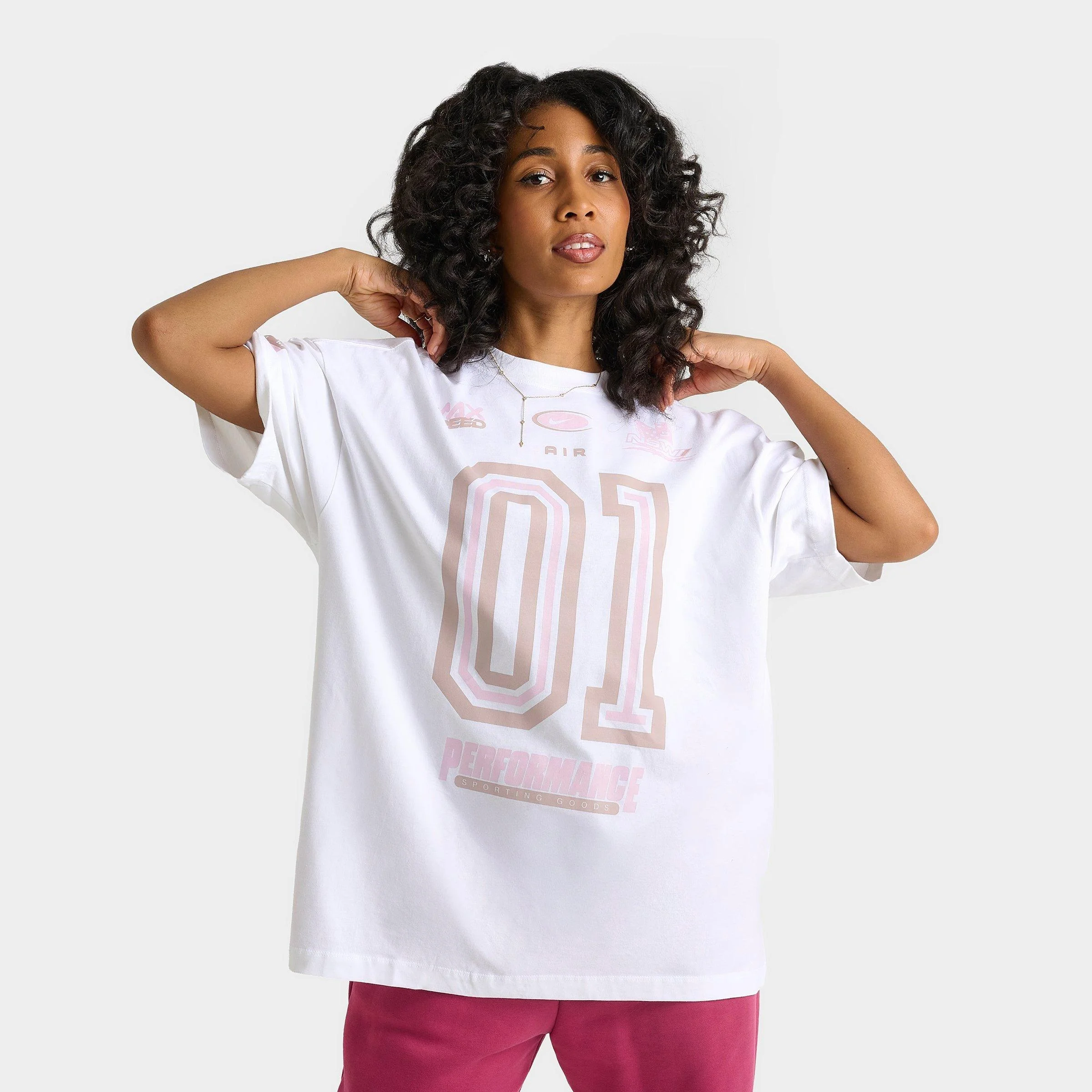 Model Sizing - Model is 5'7" and wears size Small. Waist measures 24" and Chest measures 32". Size & Fit - Roomy, relaxed fit - Shoulders Product Features - Oversized athleisure tee - Nike Air Team Sports graphics on chest, across back, and right sleeve - Midweight cotton composition has a soft feel with a loosely structured look - Ribbed crewneck construction - Short-sleeve silhouette - 100% Cotton - Machine wash - The Nike Sportswear Essentials Oversized Dunk T-Shirt is imported. Represent with in-your-face Swoosh energy when you style yourself in this Women's Nike Sportswear Essentials Oversized T-Shirt. Crafted from loosely structured midweight cotton fabric, this tee sports a generously roomy fit with Nike Team Sports graphics throughout for a street-savvy athletic aesthetic.