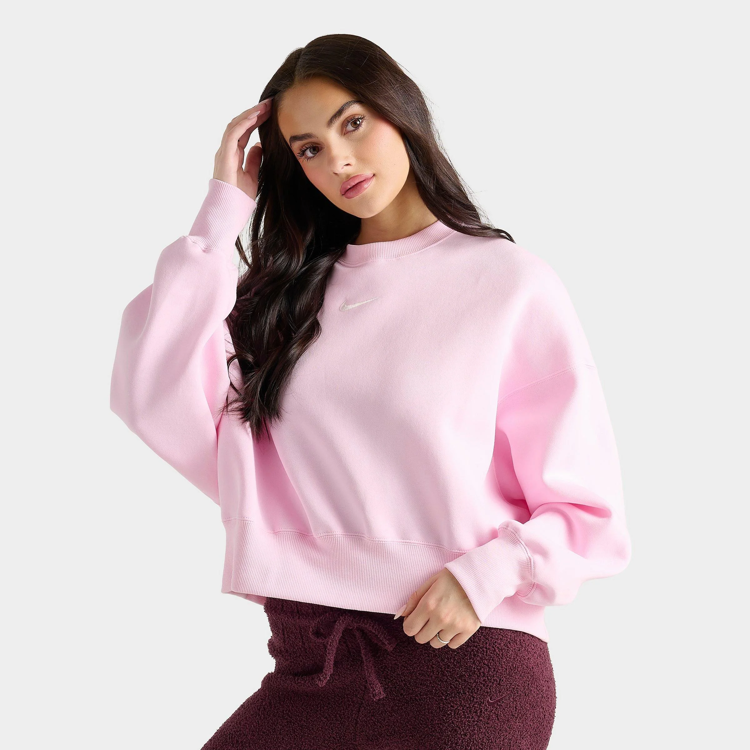 Model Sizing - Model is 5'11" and wears size 2. Waist measures 24 and Chest measures 32, B. Size & Fit - Loose fit is oversized and roomy Product Features - Classic crewneck design with long sleeves - Brushed cotton-blended fabric is smooth on the outside and cozy on the inside - Embroidered Swoosh logo at the chest for heritage style - Elongated and exaggerated ribbing for extra comfort and structure - 80% cotton, 20% polyester - Machine wash - The Nike Sportswear Phoenix Fleece Oversized Crewneck Sweatshirt is imported. Go big on cozy comfort and street-ready style when you throw on the Women's Nike Sportswear Phoenix Fleece Oversized Crewneck Sweatshirt. Smooth and comfortable brushed fleece fabric and an extra-oversized fit take comfort to a whole new level on this piece you'll reach for again and again.