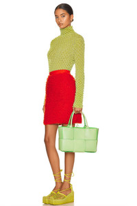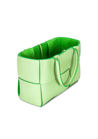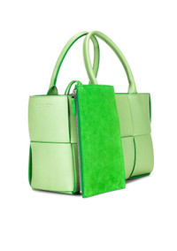 Small Arco Tote Bag – Pistachio / Parakeet / Silver Manufacturer No. 652867 V1Q71 3880 Exuding fresh elegance, this Small Arco Tote is crafted in Italy from Intreccio lambskin with a bonded suede contrast lining. The open-top silhouette cinches with a delicate tie closure that echoes the signature architectural arc form. Inside, one generous compartment is complemented by a detachable zip pouch for refined organization. Accents include silver-tone hardware, a debossed logo, and a top handle with a 5.5″ / 14 cm drop—a graceful, compact structure with personality. Details & Composition • Outer / Inner: 100% Lamb leather • Lining: Bonded suede contrast • Hardware: Silver-tone metal • Closure: Tie / drawstring • Interior: One main compartment + detachable zip pouch Dimensions • Approx. Width: 30 cm / 11.75” • Approx. Height: 20 cm / 8” • Approx. Depth: 15 cm / 6” • Handle / Top-handle Drop: 14 cm / 5.5” Origin • Made in Italy