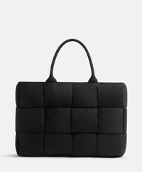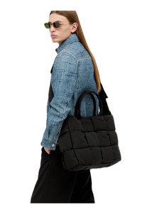 Intreccio Padded Recycled Nylon Tote Bag Crafted in Italy with signature Intreccio craftsmanship, this large tote bag is made from soft padded recycled nylon, combining luxury with sustainability. The Polyrecycled material, derived from recycled plastic bottles, is dense, durable, and water-repellent, offering a stylish yet all-terrain design. Product Details: • Large padded Intreccio tote with adjustable shoulder strap • Interior zip pocket and strap hook for keys • Made from recycled Polyrecycled nylon for a lightweight yet sturdy structure • Silver-finish hardware Specifications: • Material: 100% Polyamide • Lining: Light paper nylon • Colour: Black • Height: 34.5 cm | 13.6” • Width: 46 cm | 18.1” • Depth: 11 cm | 4.3” • Handle Drop: 18 cm | 7.1” • Strap Drop: 60 cm | 23.6” • Made in Italy