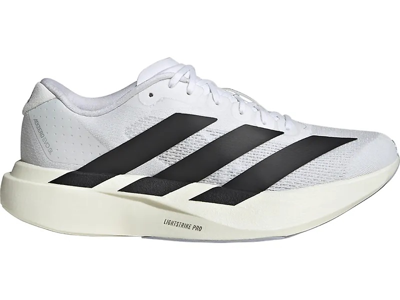 Lightweight and fast, the adidas Adizero EVO SL is built for speed. The EVO SL bridges the gap between training and racing with speed-focused design. Engineered with Lightstrike Pro foam and a dog bone-shaped nylon plate, this versatile shoe delivers high energy return in a lightweight package, so every run feels instinctively fast. Details: - Upper: A sleek engineered mesh upper gives you targeted support and breathability. - Midsole: Lightstrike Pro foam combined with a small, Top Loaded Dog Bone nylon plate gives you an ultra-smooth ride with maximum energy return so you can run your fastest. - Outsole: A Continental Rubber + Clear Rubber outsole gives you the durability to last through your training and grip for confidence at uptempo paces.